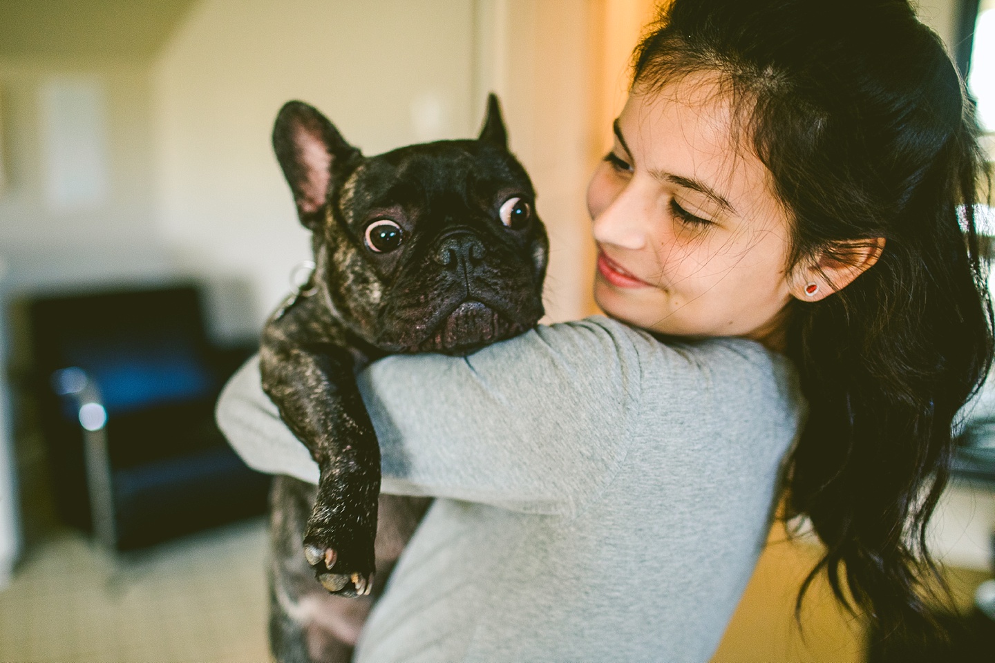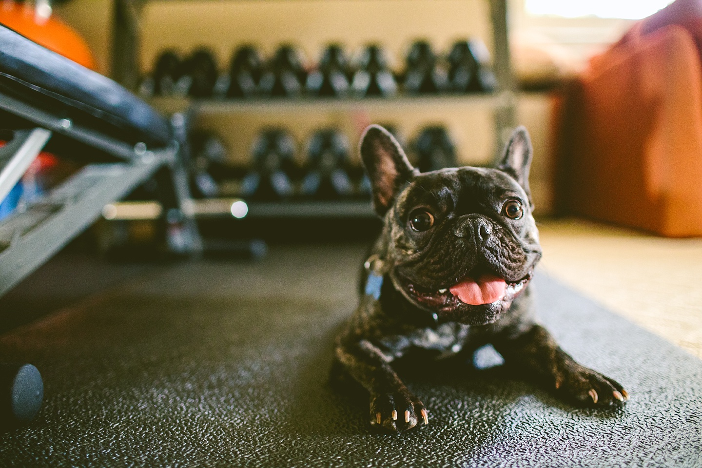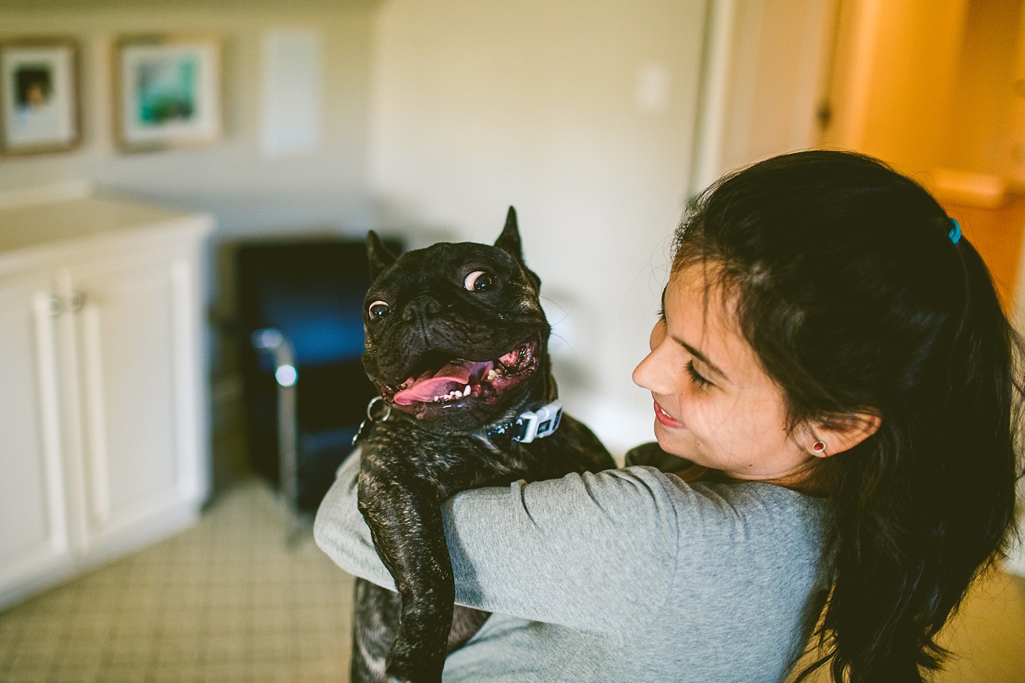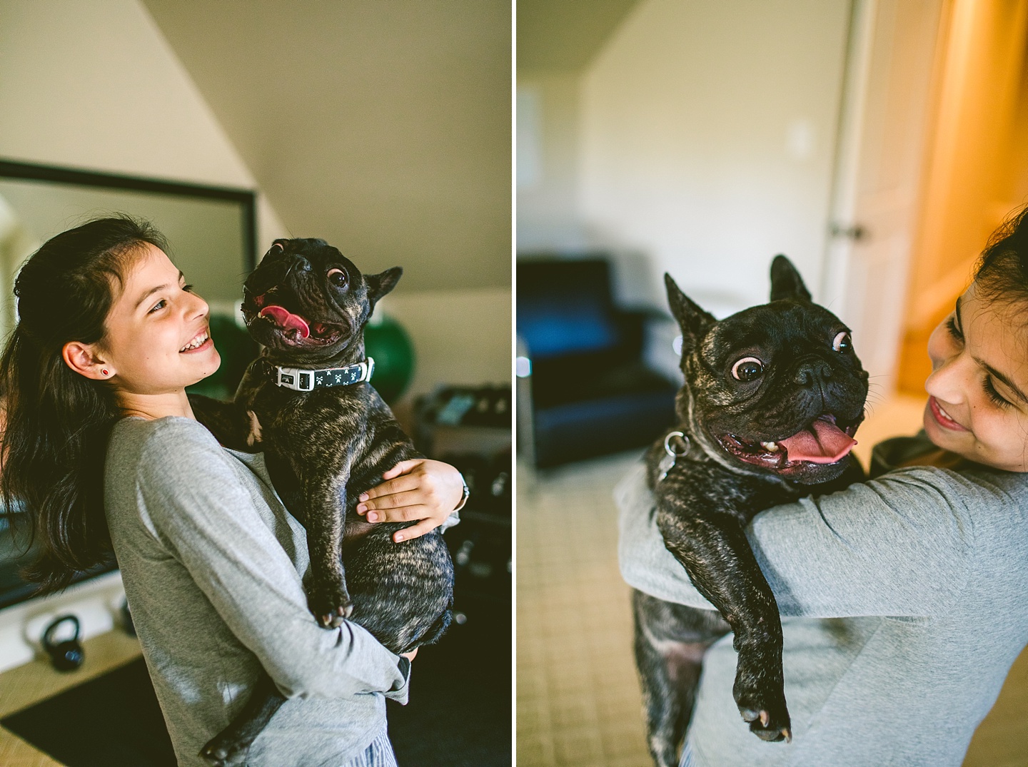 Johanna’s initial skepticism about owning a dog has turned into her sitting in the living room with Frank on her lap whispering in his ear, “Nobody loves you like I do,” so it’s safe to say he’s made quite an impression. He is small yet made entirely of muscle, which he will use to excitedly jump all over the place when you first arrive, and then collapse into an overheated heap in the exercise room while the family shouts, “He is overheating! Quick! Get him to some tile!” He is then placed on said cool tile and we wait while his batteries recharge, and then he comes barreling out of the room with his tongue stuck out again. Frank makes a constant audible noise while he breathes, and stares constantly into space. It’s like he can see into the Upside Down all the time or has been spending a lot of time on the road with the Grateful Dead. He is 100% malleable and uses 0% of his energy to do anything except overheat himself when you initially arrive, and occasionally chase balls. He owns his own Casper bed and enjoys eating ice chips from the fridge.