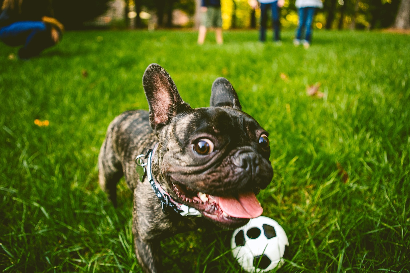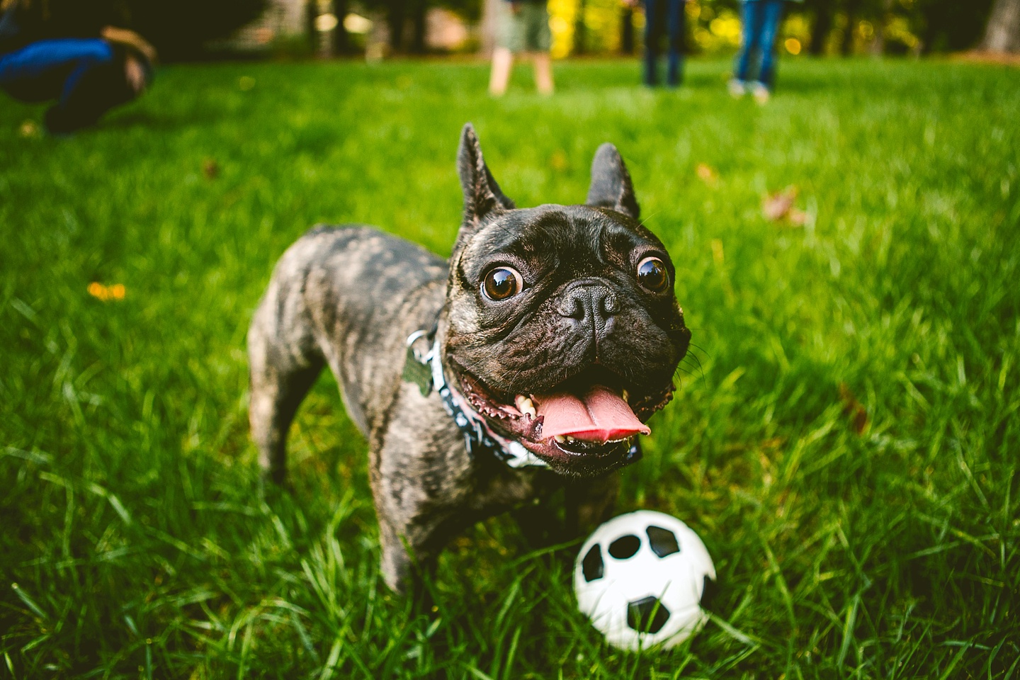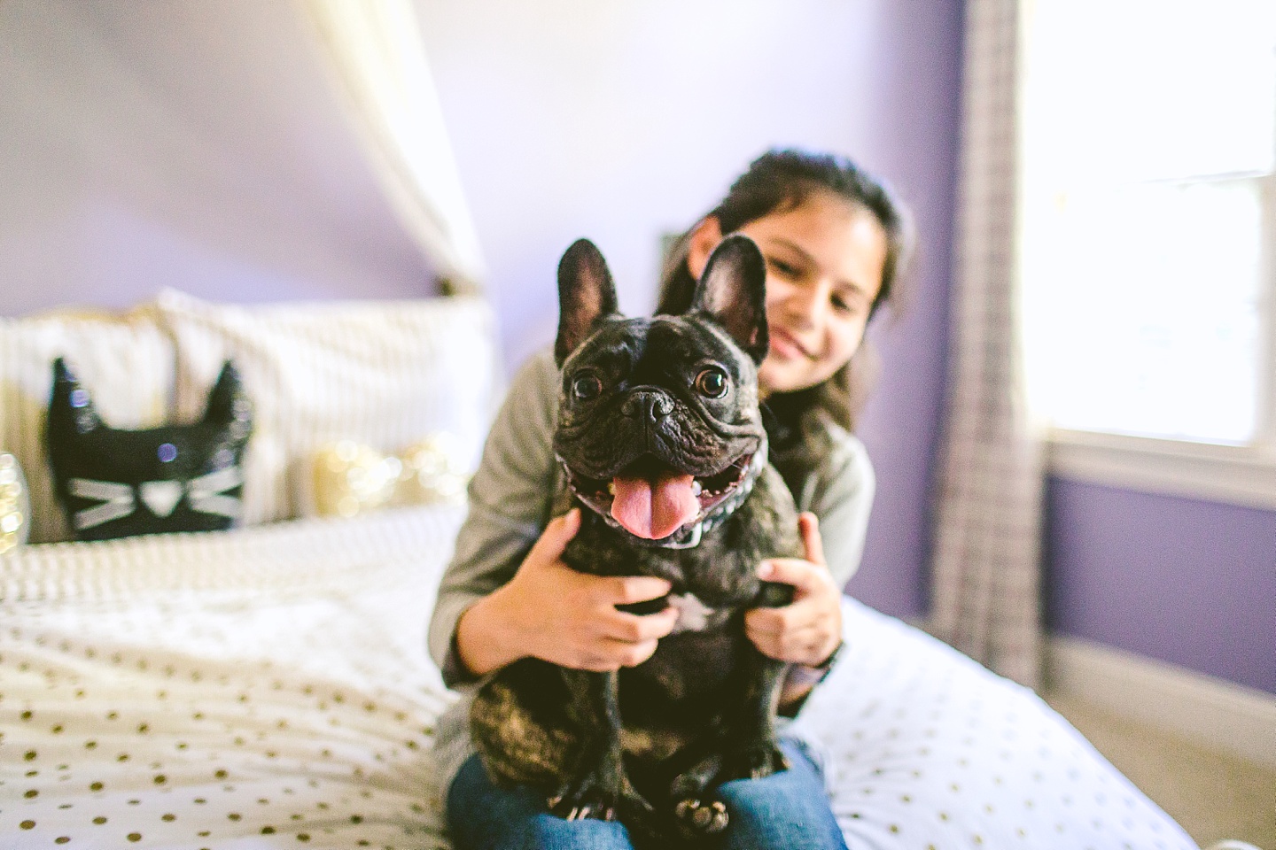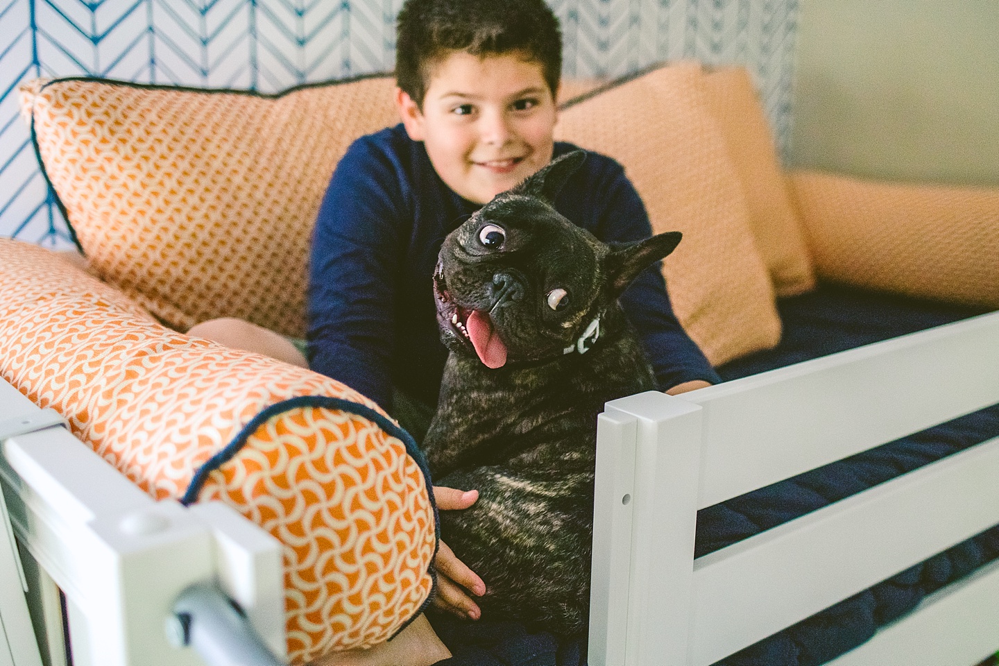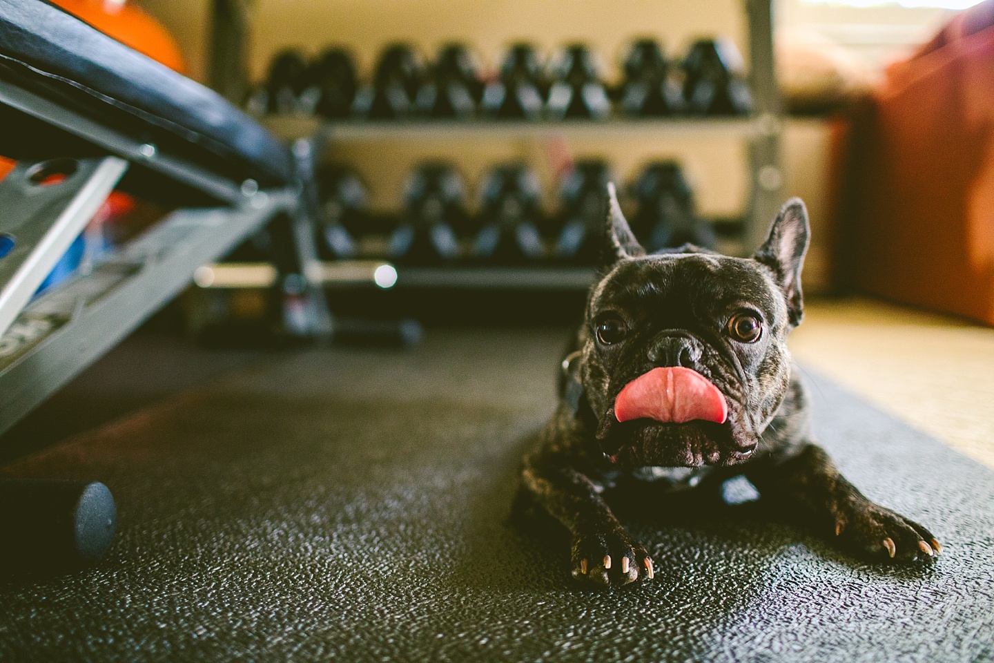 Johanna’s initial skepticism about owning a dog has turned into her sitting in the living room with Frank on her lap whispering in his ear, “Nobody loves you like I do,” so it’s safe to say he’s made quite an impression. He is small yet made entirely of muscle, which he will use to excitedly jump all over the place when you first arrive, and then collapse into an overheated heap in the exercise room while the family shouts, “He is overheating! Quick! Get him to some tile!” He is then placed on said cool tile and we wait while his batteries recharge, and then he comes barreling out of the room with his tongue stuck out again. Frank makes a constant audible noise while he breathes, and stares constantly into space. It’s like he can see into the Upside Down all the time or has been spending a lot of time on the road with the Grateful Dead. He is 100% malleable and uses 0% of his energy to do anything except overheat himself when you initially arrive, and occasionally chase balls. He owns his own Casper bed and enjoys eating ice chips from the fridge.