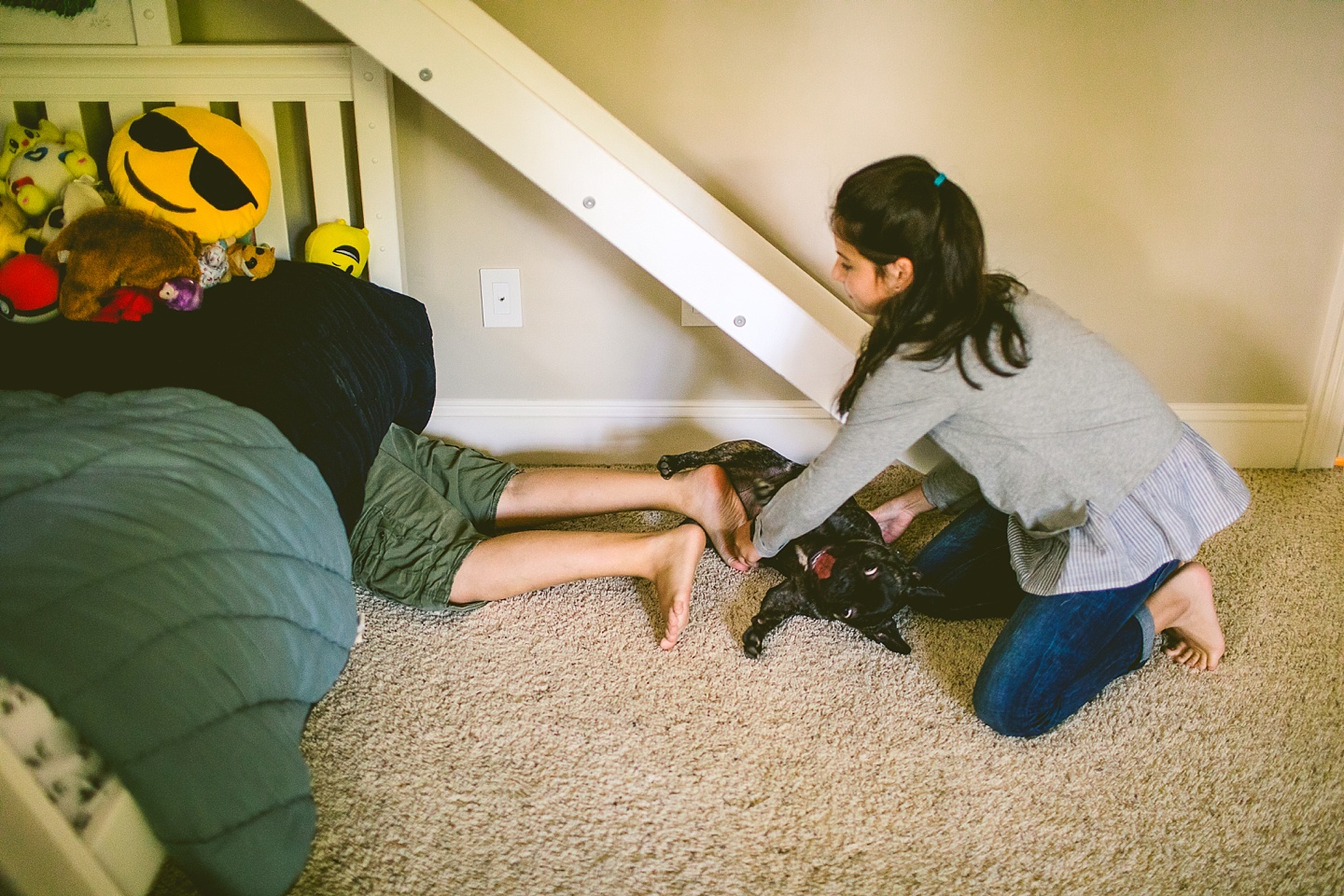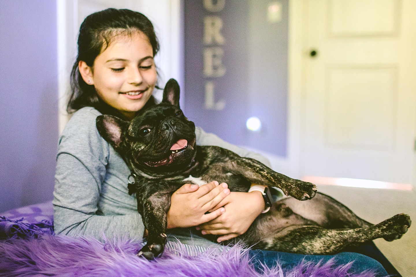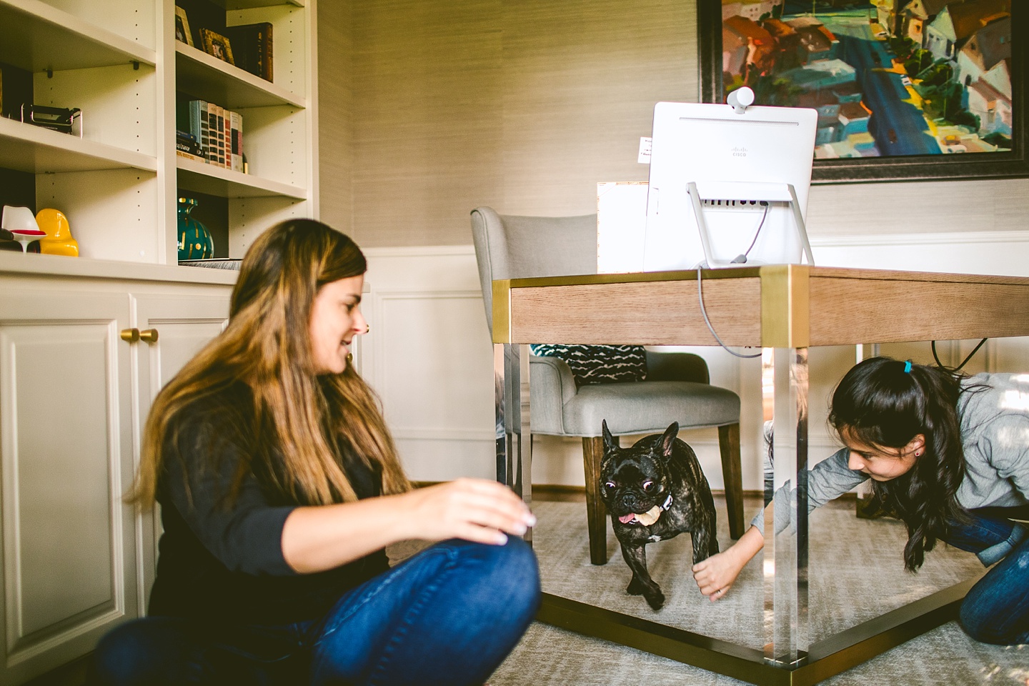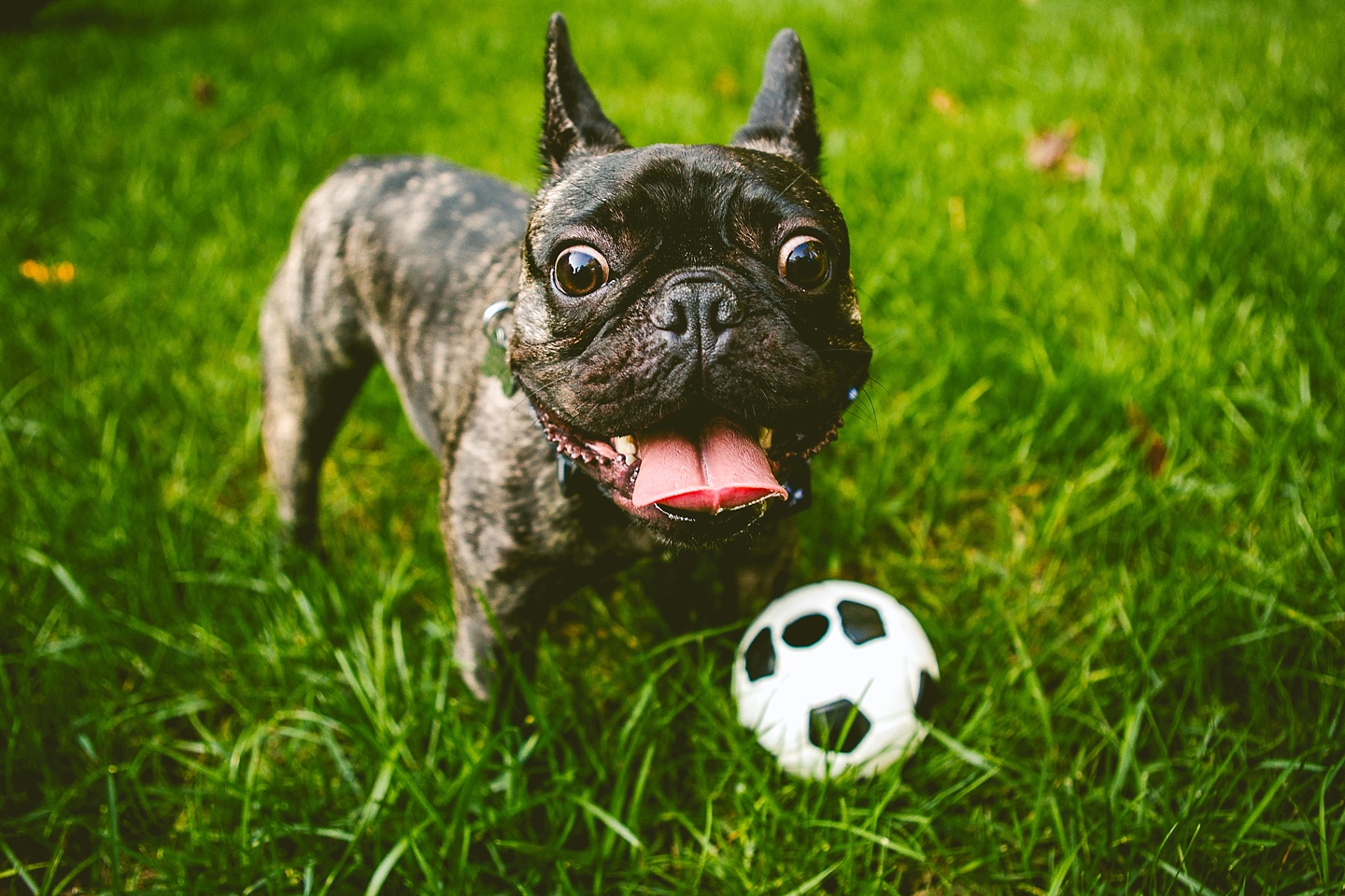 Johanna’s initial skepticism about owning a dog has turned into her sitting in the living room with Frank on her lap whispering in his ear, “Nobody loves you like I do,” so it’s safe to say he’s made quite an impression. He is small yet made entirely of muscle, which he will use to excitedly jump all over the place when you first arrive, and then collapse into an overheated heap in the exercise room while the family shouts, “He is overheating! Quick! Get him to some tile!” He is then placed on said cool tile and we wait while his batteries recharge, and then he comes barreling out of the room with his tongue stuck out again. Frank makes a constant audible noise while he breathes, and stares constantly into space. It’s like he can see into the Upside Down all the time or has been spending a lot of time on the road with the Grateful Dead. He is 100% malleable and uses 0% of his energy to do anything except overheat himself when you initially arrive, and occasionally chase balls. He owns his own Casper bed and enjoys eating ice chips from the fridge.