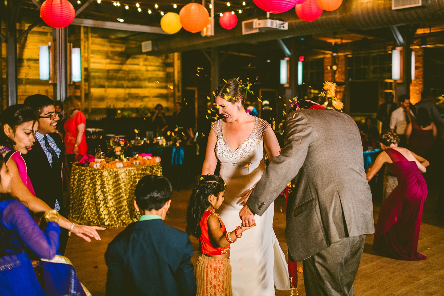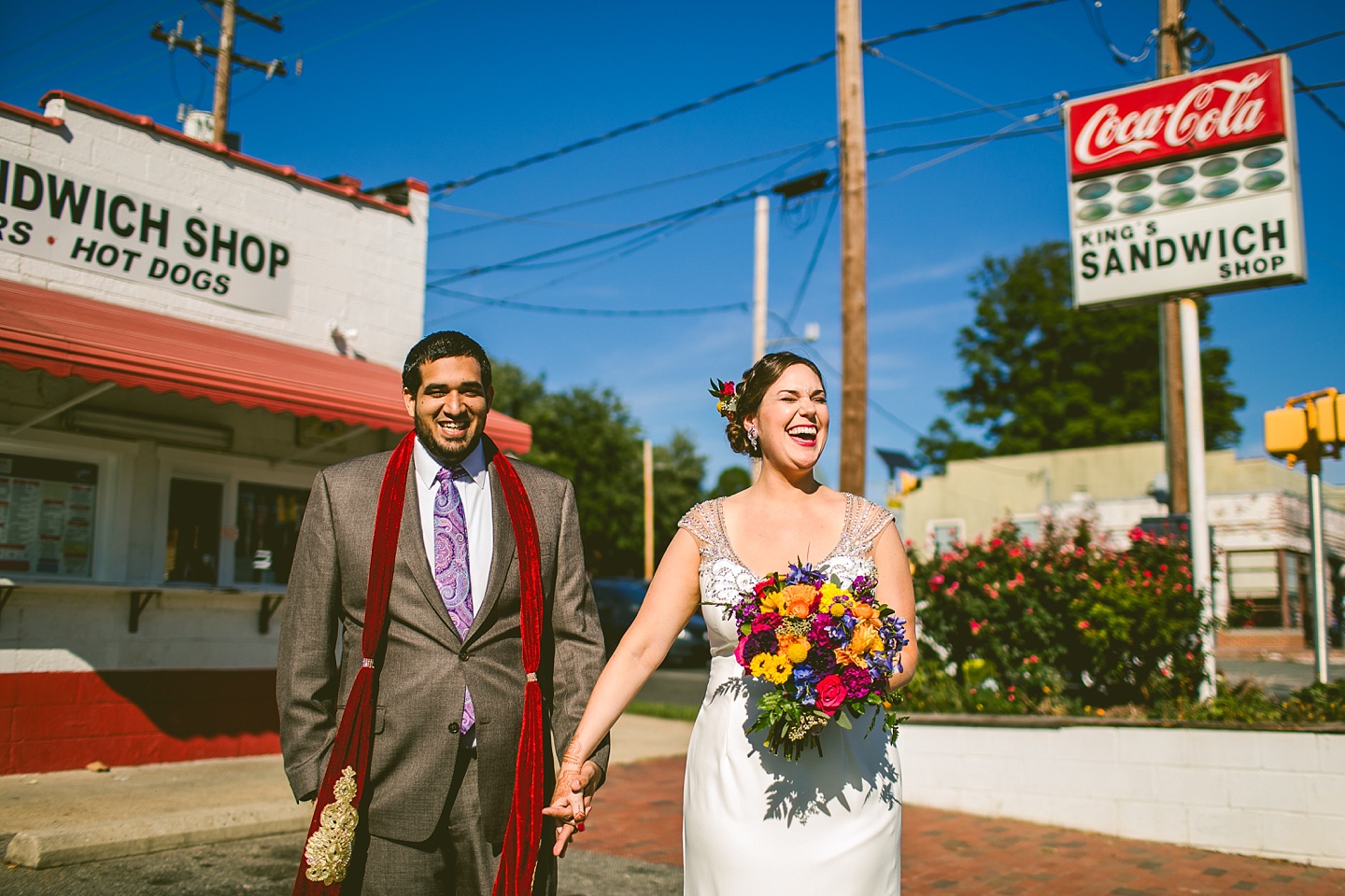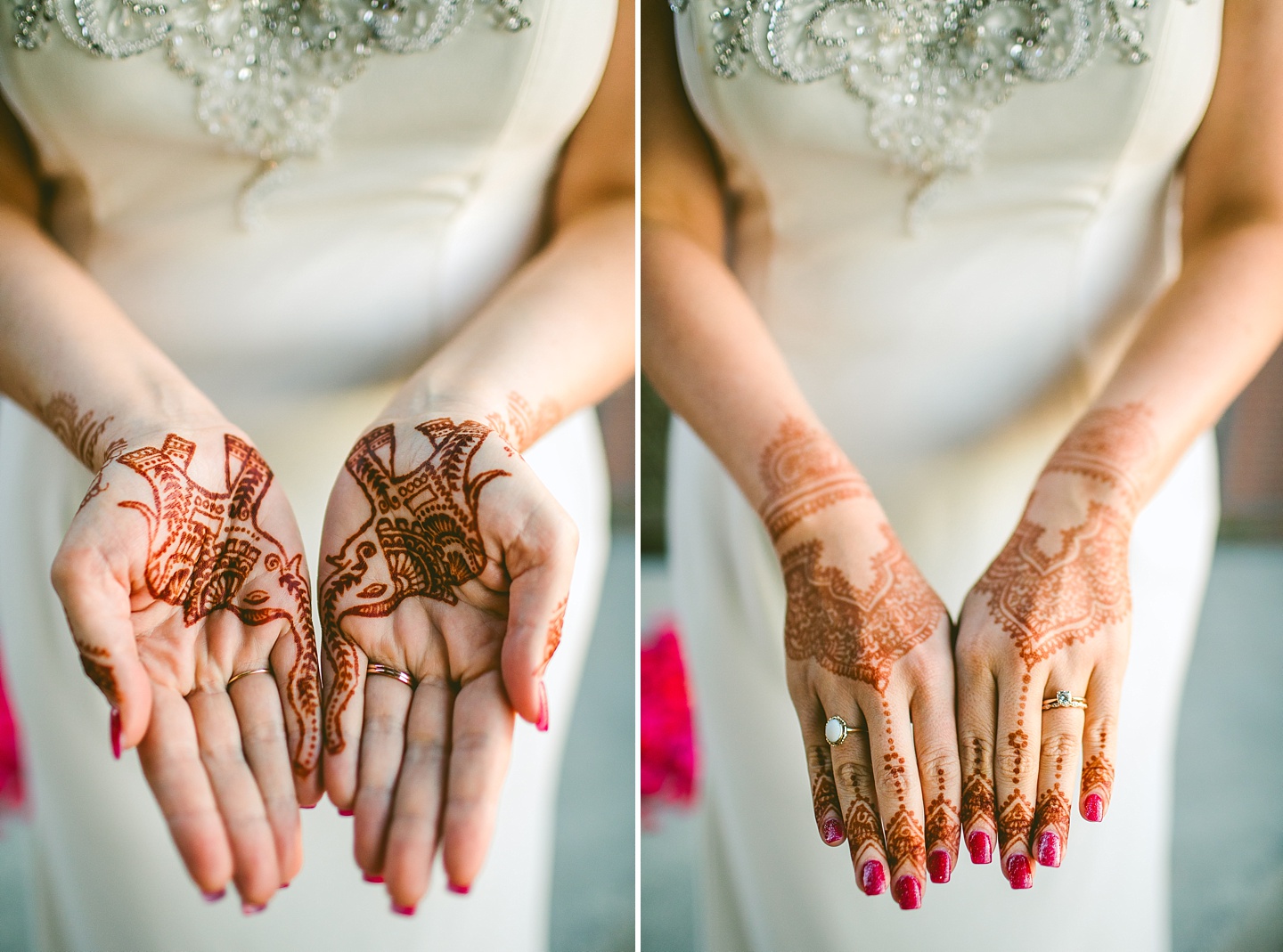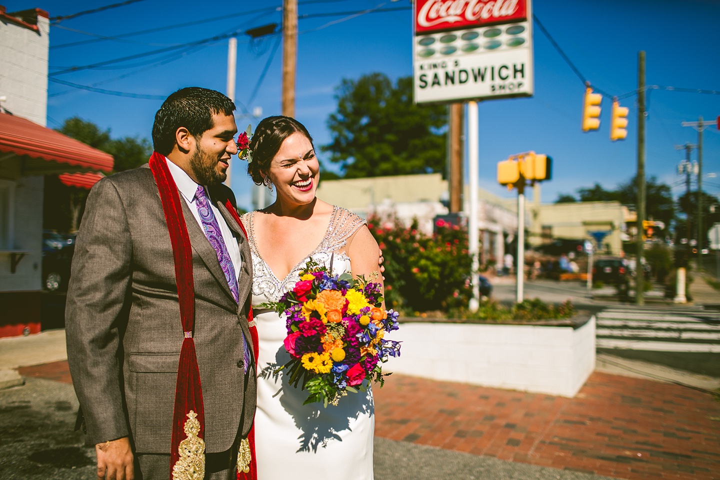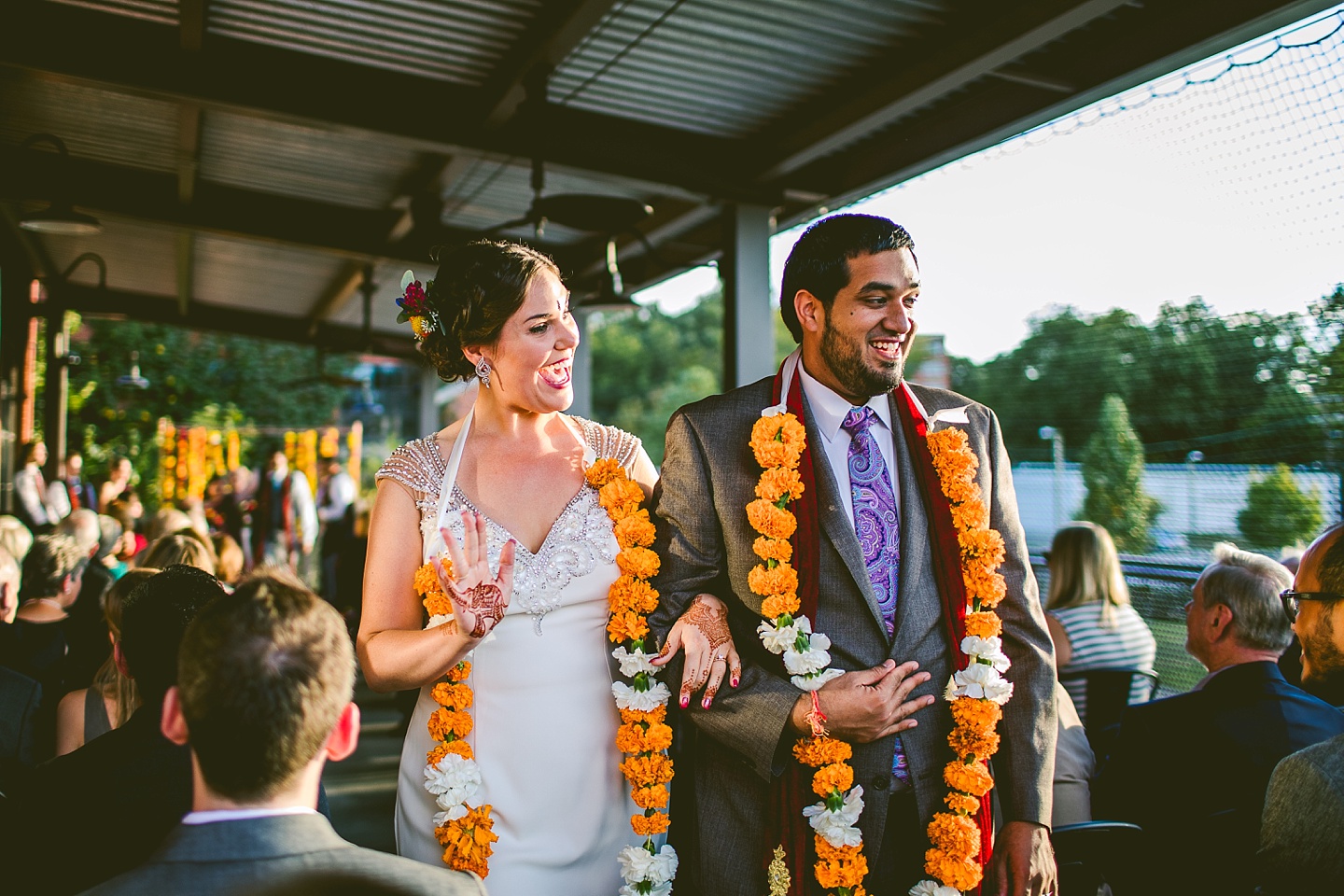 And Kate and Parag are also SO GOOD. They are perfect for each other and make each other laugh often. Kate has a wonderful set of perfect teeth so it’s good that Parag keeps her laughing so we can admire them. This was their second wedding to each other. Their first was a traditional Hindu ceremony, and this was their American and Indian fusion wedding. Kate sent me the pictures from their first one which were amazing, and Kate wore a really incredible nose ring that was so large it defied the laws of gravity. Their Indian-fusion wedding was lacking in the nose ring department, but it made up for it with amazing henna designs in the shape of little elephants and brilliant colors sprinkled all over their ceremony and reception. There were traditional Indian dances and American popcorn next to the Durham Bull’s old baseball field. The little kids dismantled their incredible floral altar during the reception and threw repeatedly threw the flowers down Parag’s suit jacket, and they danced away the night with their fabulous family and friends. We are thrilled to have been part of Kate and Parag’s awesome fusion wedding, and so glad they came down from DC to celebrate in Durham!