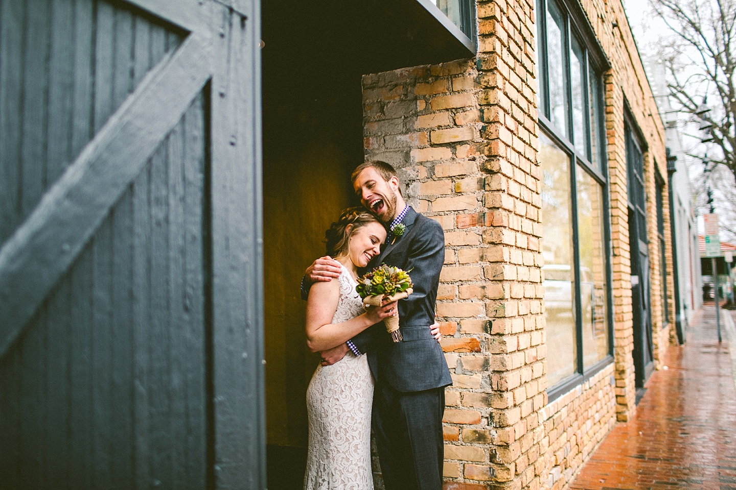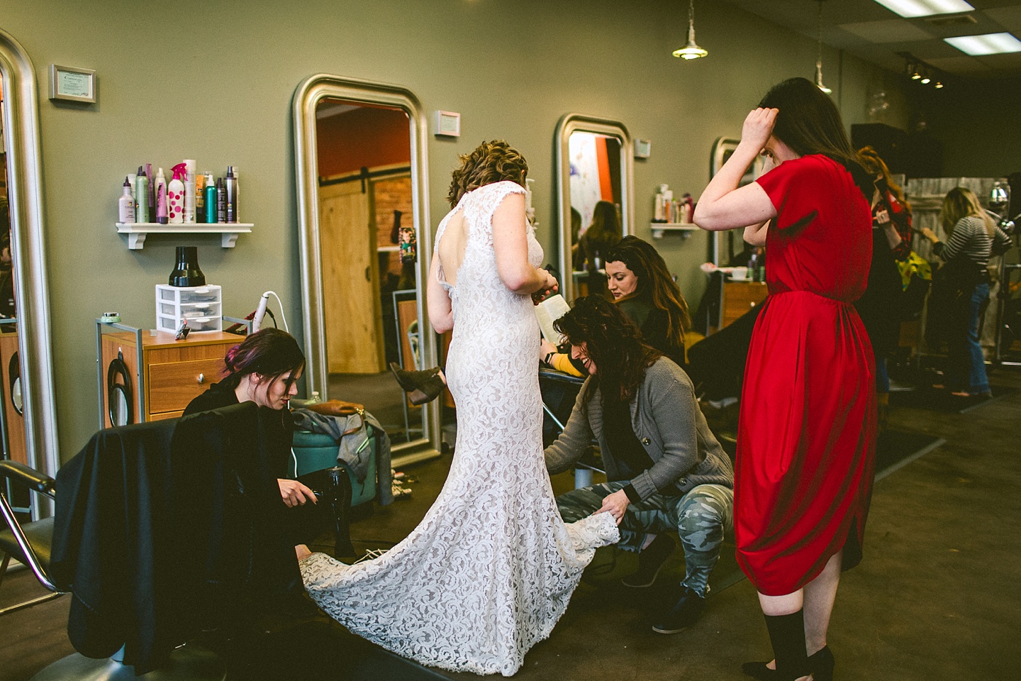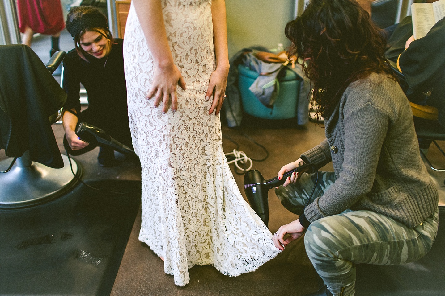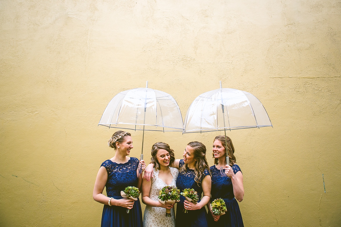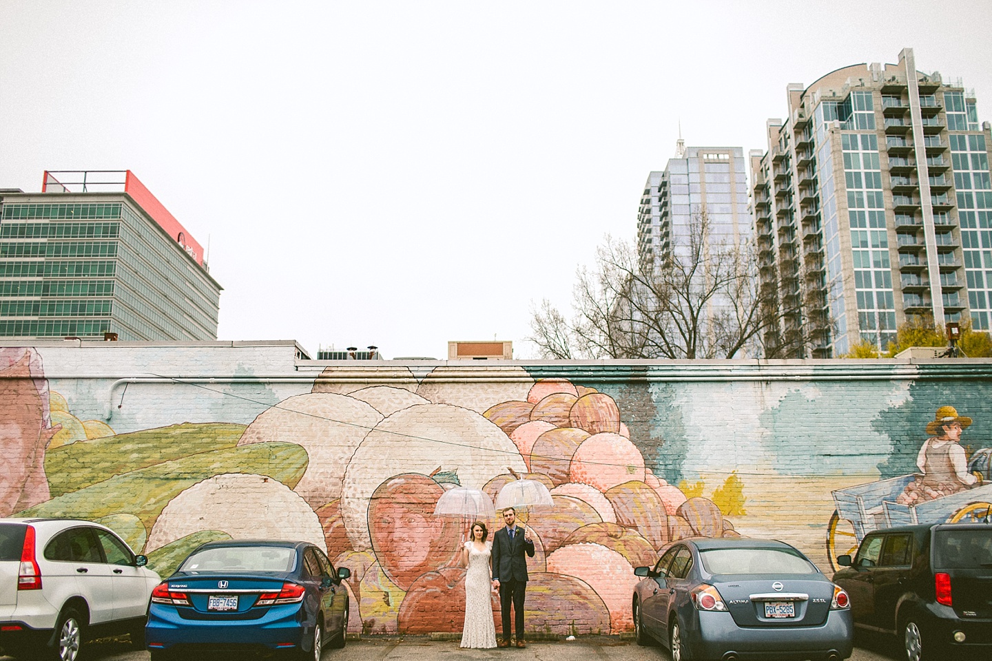 Because Melissa and Jackson are so badass, they stayed super positive and super wonderful and super friendly despite all of this! And so did their bridal party! And it was cold! And wet! And YET WE MARCHED ON. Equipped with nothing but clear umbrellas and a will of steel, we blocked traffic in City Market and did what we came there to do. We took pictures in that plain yellow alley that used to have the fish! BOOM! Then a car moved and we were able to shoot in front of the weird veggie faces wall! BAM! And Melissa’s dress was absolutely soaked afterward and so were her shoes, so we called in a favor to the wonderful ladies we just photographed at the Design Gallery Salon just recently, and they were so kind as to throw Melissa’s Toms in a dryer for a few minutes while they used several blow dryers on the bottom of her dress. :) TA-DA!