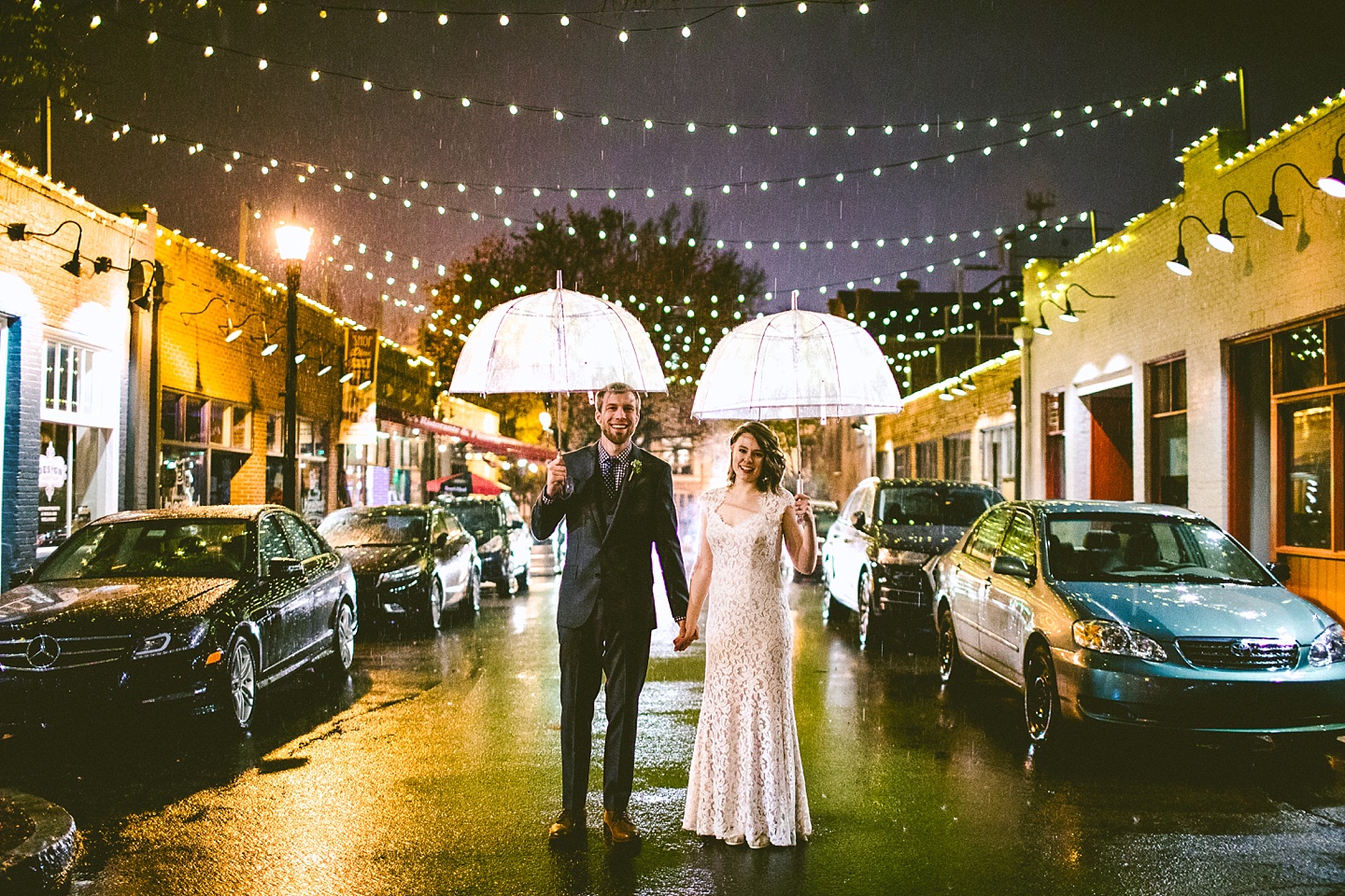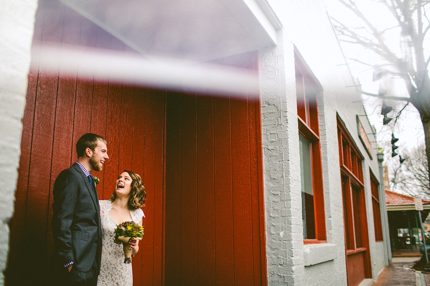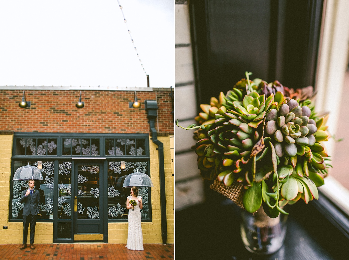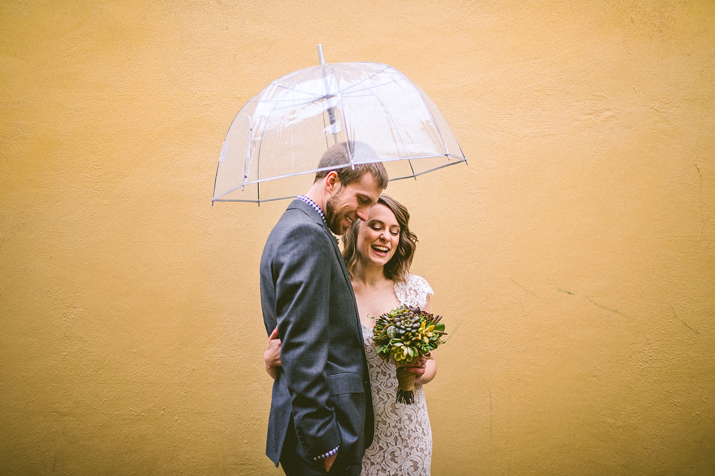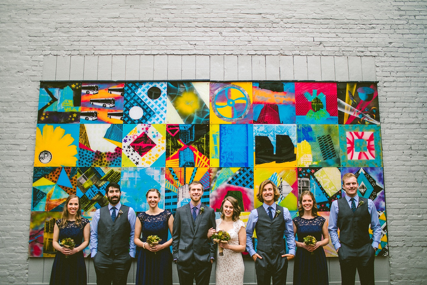 Because Melissa and Jackson are so badass, they stayed super positive and super wonderful and super friendly despite all of this! And so did their bridal party! And it was cold! And wet! And YET WE MARCHED ON. Equipped with nothing but clear umbrellas and a will of steel, we blocked traffic in City Market and did what we came there to do. We took pictures in that plain yellow alley that used to have the fish! BOOM! Then a car moved and we were able to shoot in front of the weird veggie faces wall! BAM! And Melissa’s dress was absolutely soaked afterward and so were her shoes, so we called in a favor to the wonderful ladies we just photographed at the Design Gallery Salon just recently, and they were so kind as to throw Melissa’s Toms in a dryer for a few minutes while they used several blow dryers on the bottom of her dress. :) TA-DA!