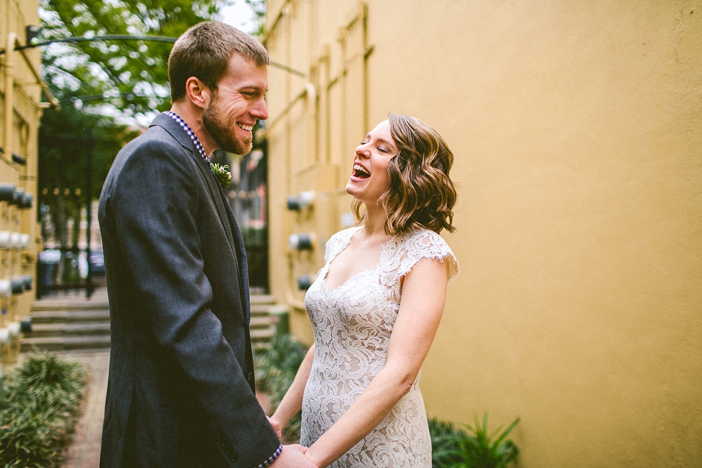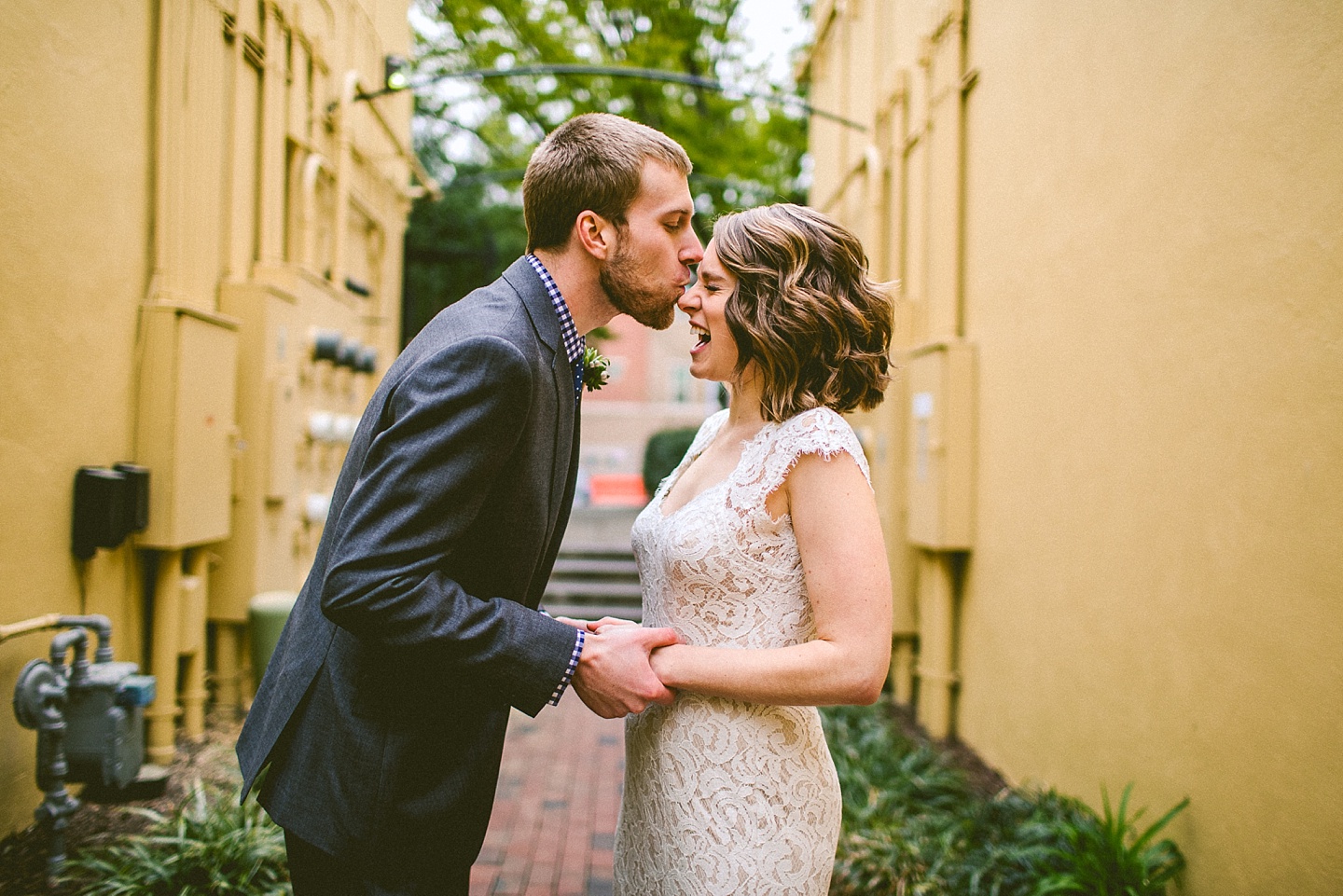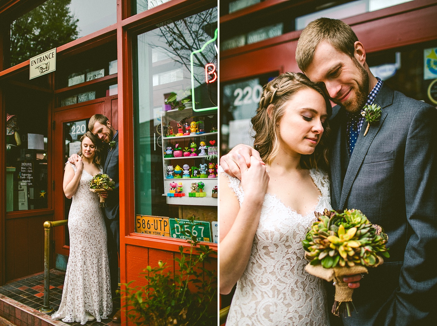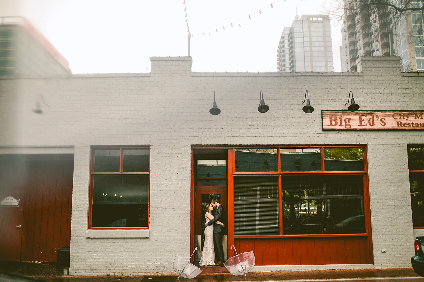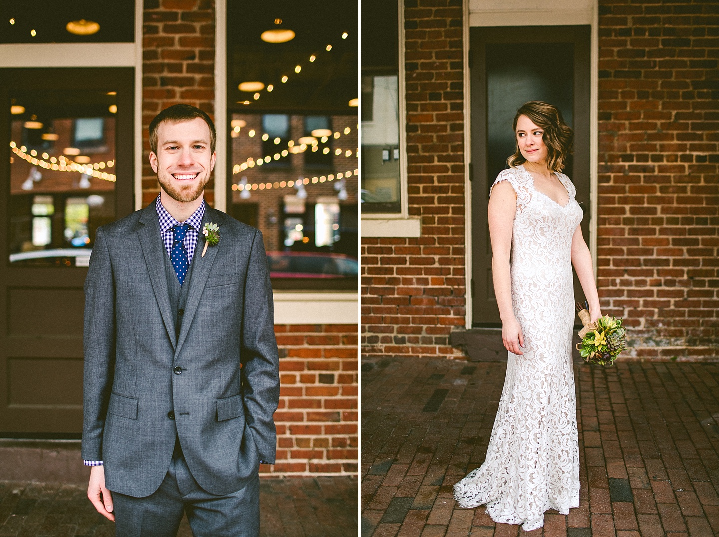 Because Melissa and Jackson are so badass, they stayed super positive and super wonderful and super friendly despite all of this! And so did their bridal party! And it was cold! And wet! And YET WE MARCHED ON. Equipped with nothing but clear umbrellas and a will of steel, we blocked traffic in City Market and did what we came there to do. We took pictures in that plain yellow alley that used to have the fish! BOOM! Then a car moved and we were able to shoot in front of the weird veggie faces wall! BAM! And Melissa’s dress was absolutely soaked afterward and so were her shoes, so we called in a favor to the wonderful ladies we just photographed at the Design Gallery Salon just recently, and they were so kind as to throw Melissa’s Toms in a dryer for a few minutes while they used several blow dryers on the bottom of her dress. :) TA-DA!