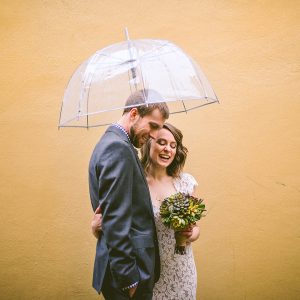 Melissa and Jackson are two rain proof kids in both mind and spirit. The forecast was unusually cold for March, but also called for an epic downpour to start riiiiight at the time of their first look. Geoff and I were optimistic – rain almost always get pushed back, and all we needed was for it to hold off an hour. But, because this is how the weather seems to be rolling so far in 2018, the rain started right at the first look, and continued on through their pictures. Then I promised Melissa that there was an alley nearby that had a fish mural. But… the city had painted over it to be a plain yellow. Then they got excited about the weird fruit and vegetable and strange faces mural behind it, but there were cars in every. single. spot. in front of the wall. But then! Thennn!
