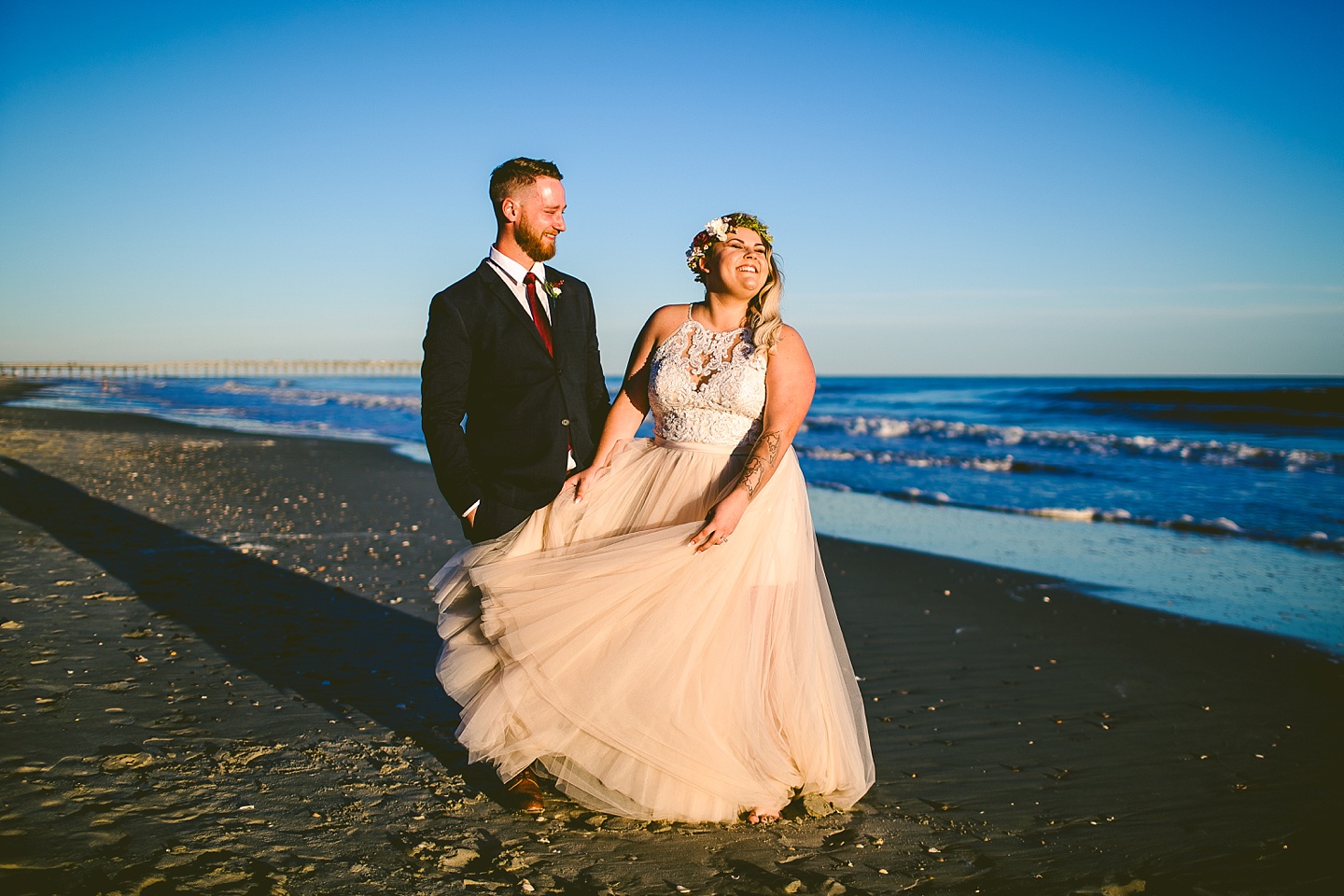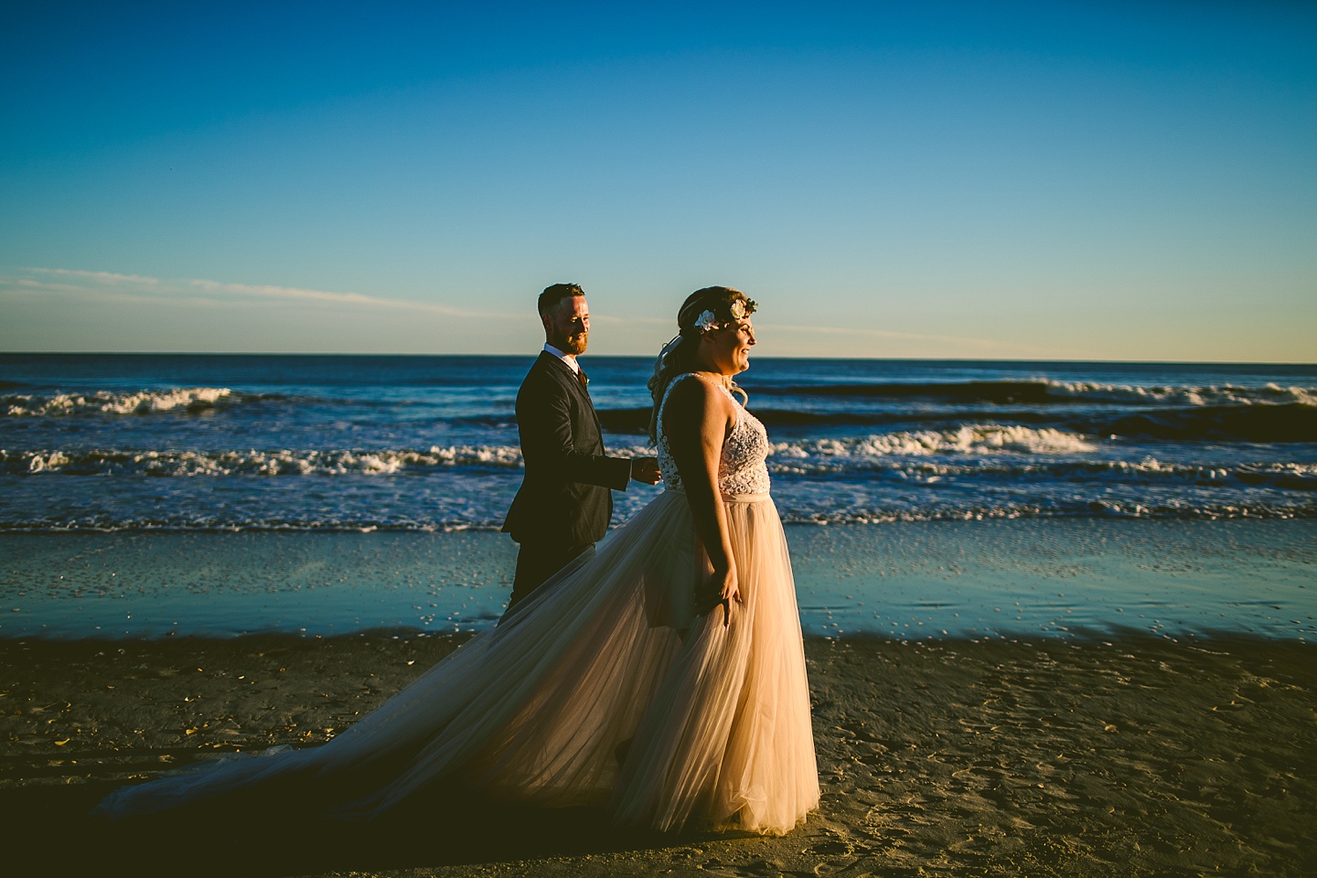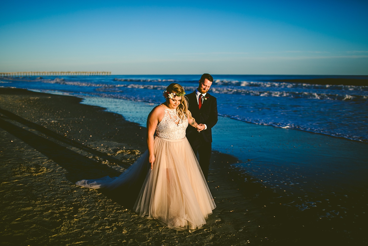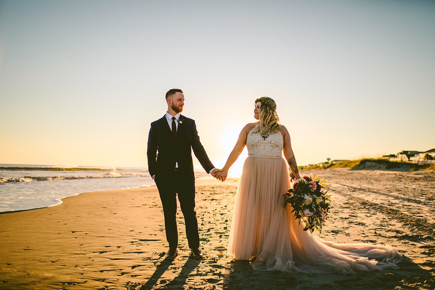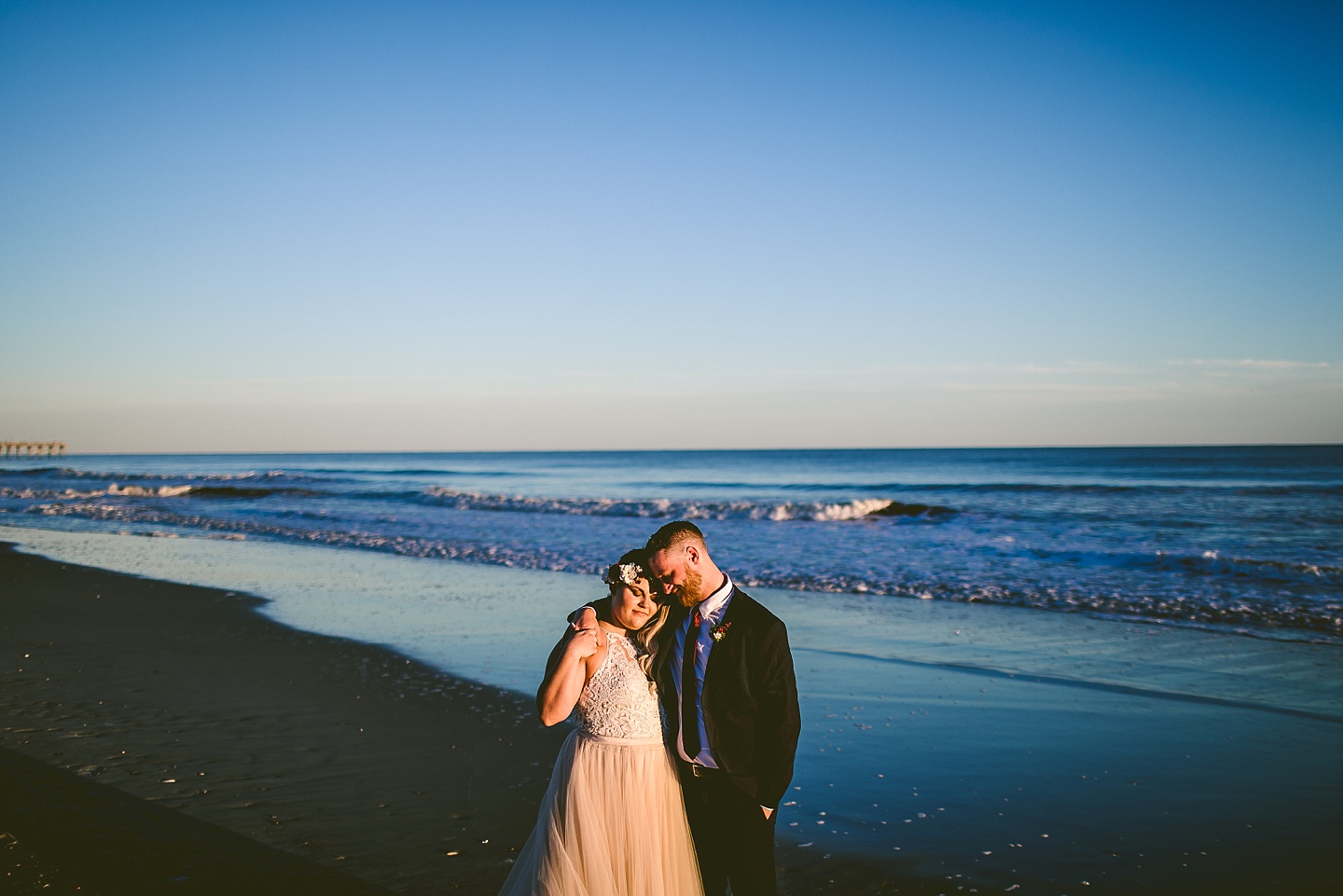 Jessica and Andrew hail all the way up from Minnesota! And, like all Minnesota people I’ve encountered in my lifetime, they are exceedingly nice and can also tolerate much colder temperatures than me. These guys are avid travelers, and they wanted to share the joy of traveling with their family and friends, so they decided to hold their wedding in Ocean Isle, NC and have everyone join them. They rented an enormous and gorgeously updated beach house, and had a ceremony out by the ocean. It was a sunny and clear day while Jess and Andrew strolled along the beach in the sunset with me and videographer Matt from Dogwood Media shouting “Dope dope dope” at them… which is, I’m pretty sure, exactly what they pictured their wedding day being like. We had a ridiculous amount of fun with these guys. And look at how pretty they are. Just look at them. SO PRETTY. Jessica’s dress was gorgeous and I had a fun time making her spin around repeatedly and then trying to shake the sand out of the tulle. They then danced the night away with a super fun group of people who love to pretend they’re all jumping rope at the reception. We are so glad that they asked us to join them out in Ocean Isle – we had never been to that part of the NC coast before (we’re originally from Pittsburgh so still have much of this state to explore) and we loved it! It was clear of people and the light is beautiful out there in November, and the beach is pristine in every direction. We’re so happy and grateful these guys chose North Carolina and chose US to be with them for their wedding day. Congratulations to you both! You beautiful people you.