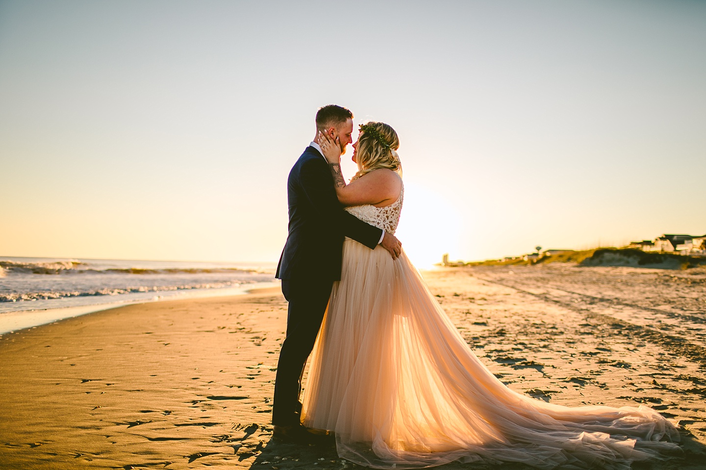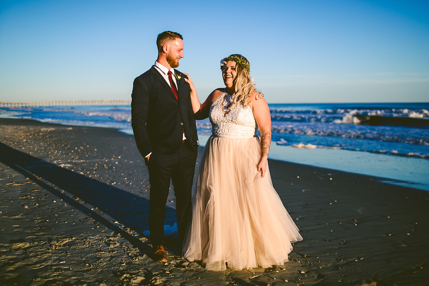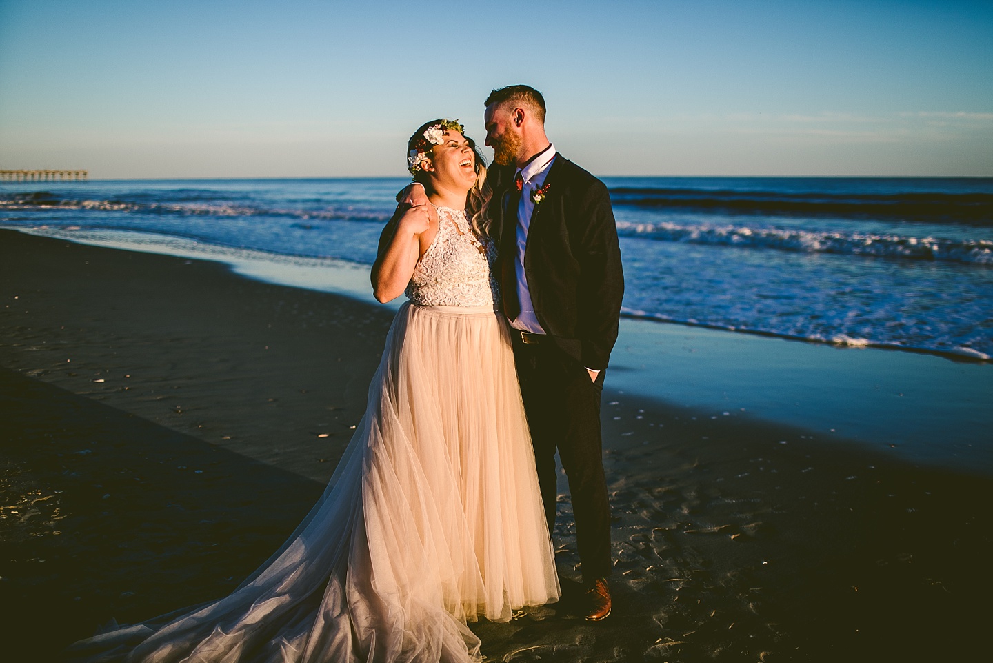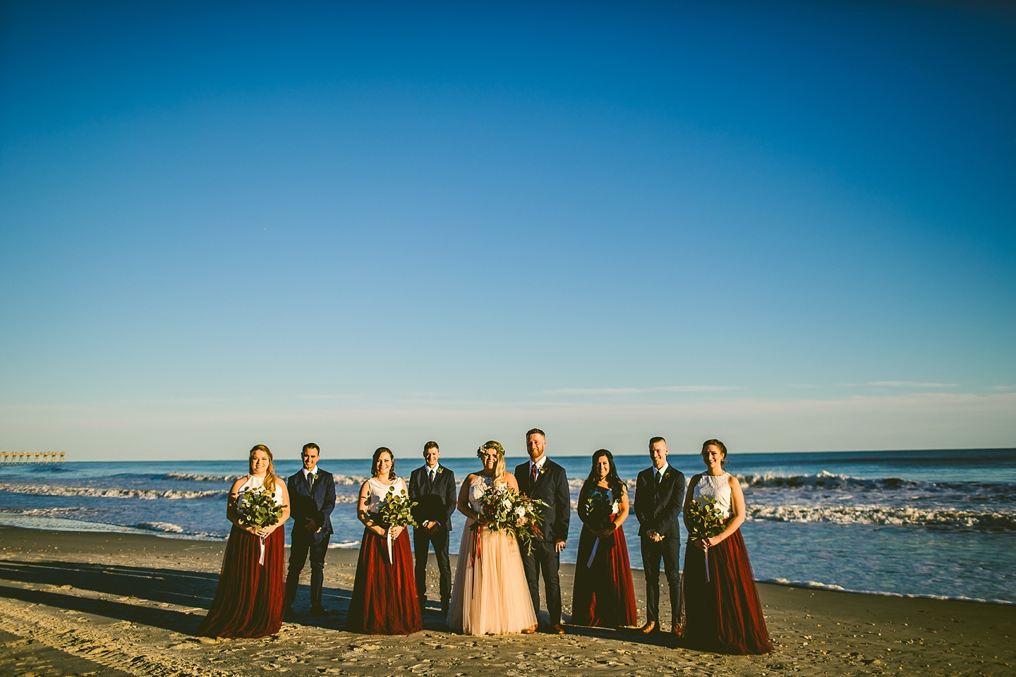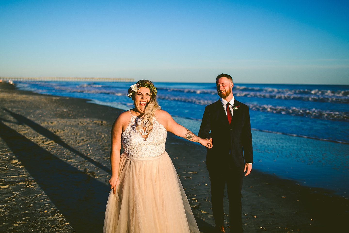 Jessica and Andrew hail all the way up from Minnesota! And, like all Minnesota people I’ve encountered in my lifetime, they are exceedingly nice and can also tolerate much colder temperatures than me. These guys are avid travelers, and they wanted to share the joy of traveling with their family and friends, so they decided to hold their wedding in Ocean Isle, NC and have everyone join them. They rented an enormous and gorgeously updated beach house, and had a ceremony out by the ocean. It was a sunny and clear day while Jess and Andrew strolled along the beach in the sunset with me and videographer Matt from Dogwood Media shouting “Dope dope dope” at them… which is, I’m pretty sure, exactly what they pictured their wedding day being like. We had a ridiculous amount of fun with these guys. And look at how pretty they are. Just look at them. SO PRETTY. Jessica’s dress was gorgeous and I had a fun time making her spin around repeatedly and then trying to shake the sand out of the tulle. They then danced the night away with a super fun group of people who love to pretend they’re all jumping rope at the reception. We are so glad that they asked us to join them out in Ocean Isle – we had never been to that part of the NC coast before (we’re originally from Pittsburgh so still have much of this state to explore) and we loved it! It was clear of people and the light is beautiful out there in November, and the beach is pristine in every direction. We’re so happy and grateful these guys chose North Carolina and chose US to be with them for their wedding day. Congratulations to you both! You beautiful people you.