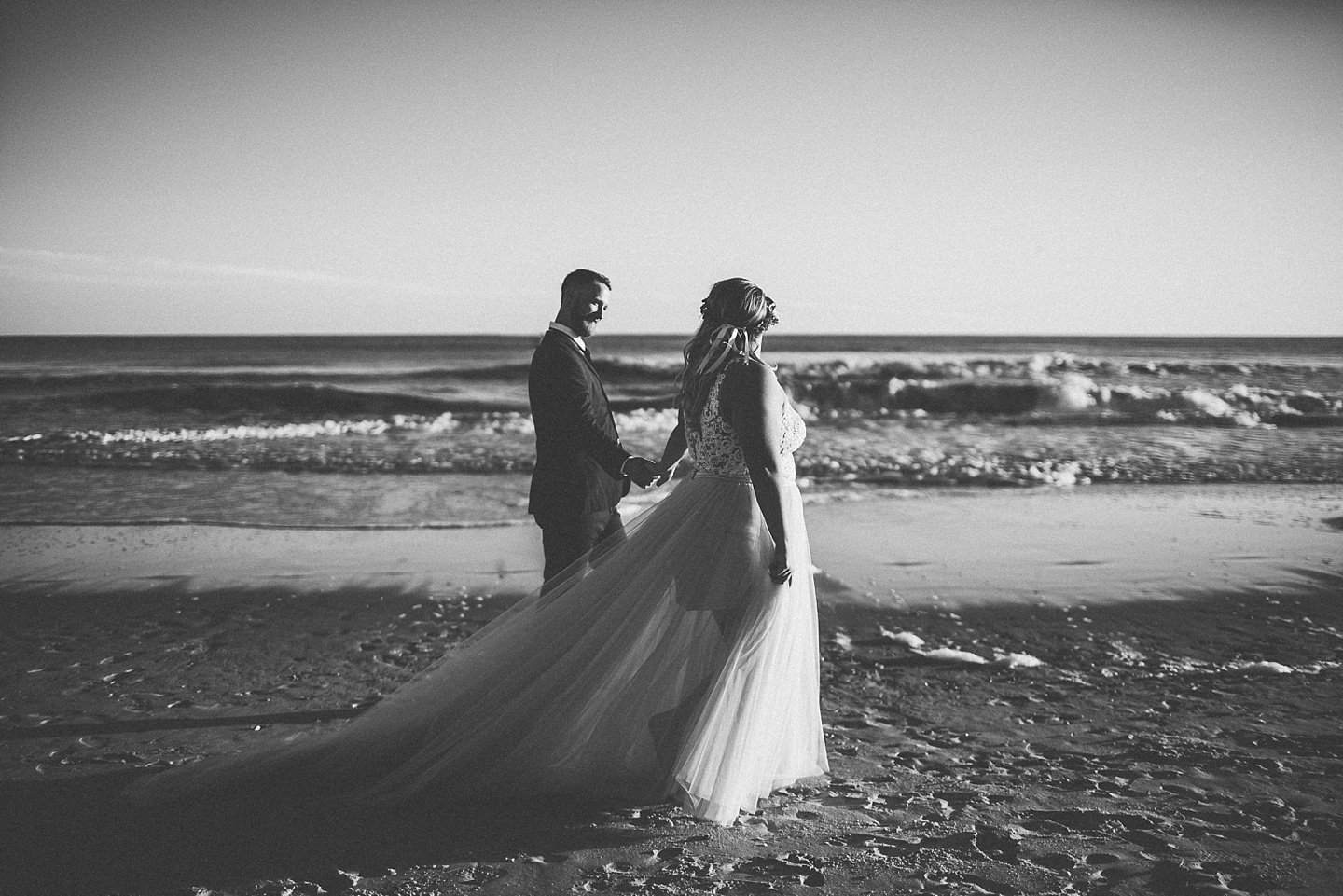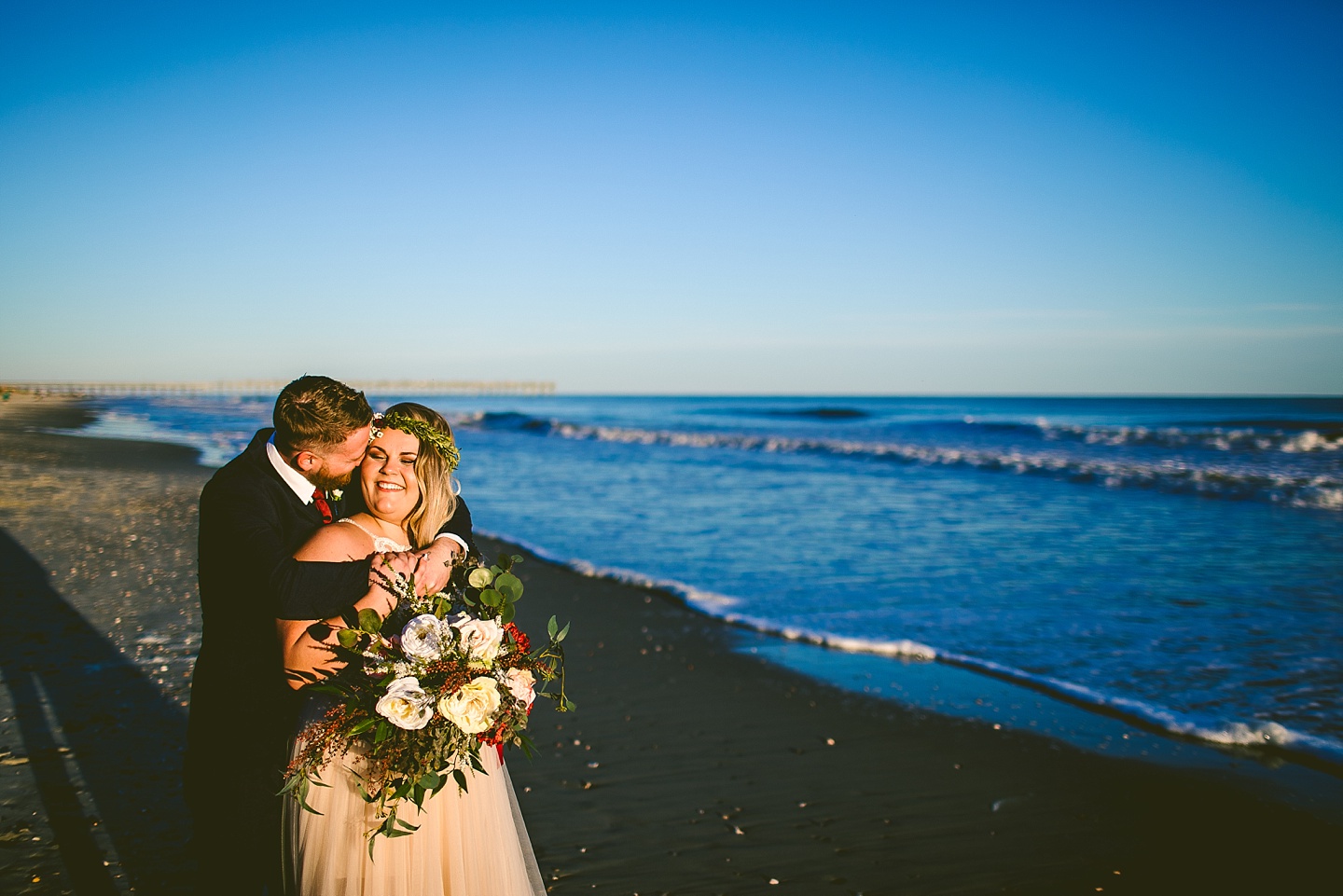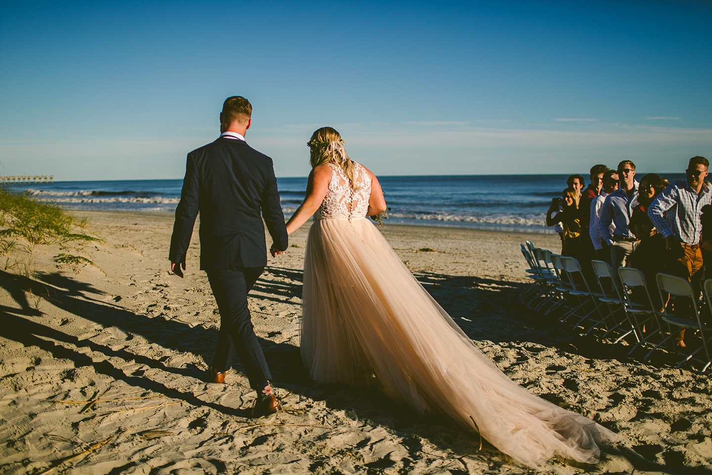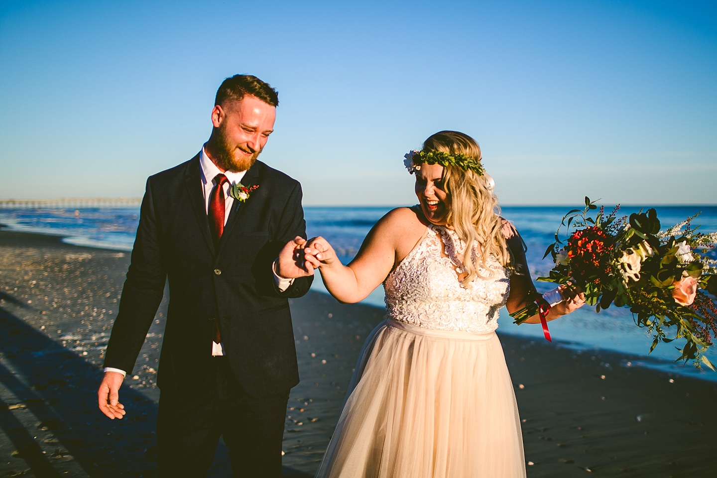 Jessica and Andrew hail all the way up from Minnesota! And, like all Minnesota people I’ve encountered in my lifetime, they are exceedingly nice and can also tolerate much colder temperatures than me. These guys are avid travelers, and they wanted to share the joy of traveling with their family and friends, so they decided to hold their wedding in Ocean Isle, NC and have everyone join them. They rented an enormous and gorgeously updated beach house, and had a ceremony out by the ocean. It was a sunny and clear day while Jess and Andrew strolled along the beach in the sunset with me and videographer Matt from Dogwood Media shouting “Dope dope dope” at them… which is, I’m pretty sure, exactly what they pictured their wedding day being like. We had a ridiculous amount of fun with these guys. And look at how pretty they are. Just look at them. SO PRETTY. Jessica’s dress was gorgeous and I had a fun time making her spin around repeatedly and then trying to shake the sand out of the tulle. They then danced the night away with a super fun group of people who love to pretend they’re all jumping rope at the reception. We are so glad that they asked us to join them out in Ocean Isle – we had never been to that part of the NC coast before (we’re originally from Pittsburgh so still have much of this state to explore) and we loved it! It was clear of people and the light is beautiful out there in November, and the beach is pristine in every direction. We’re so happy and grateful these guys chose North Carolina and chose US to be with them for their wedding day. Congratulations to you both! You beautiful people you.