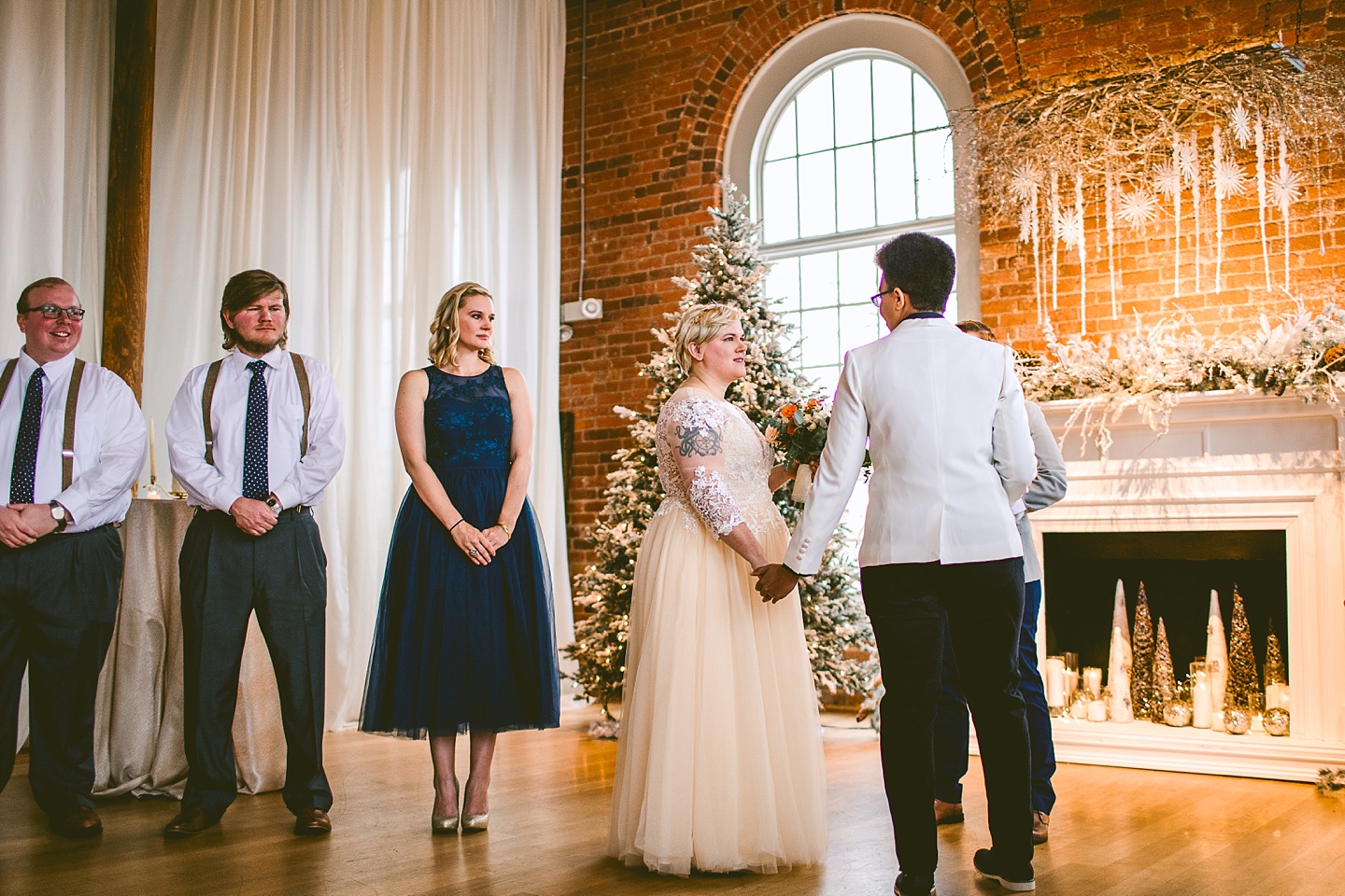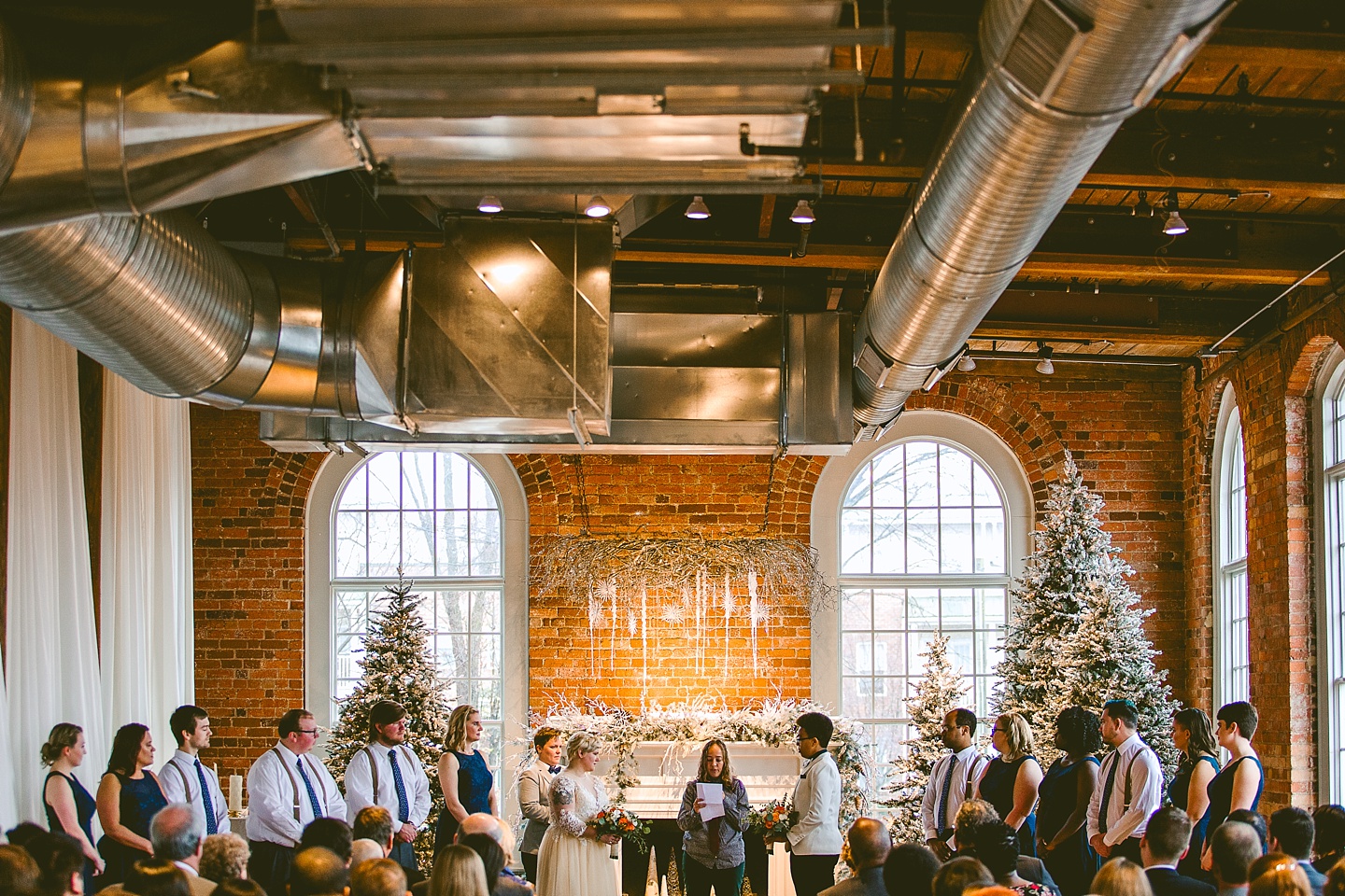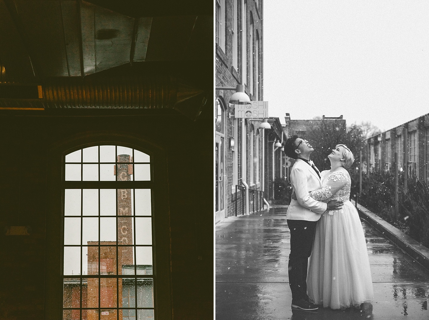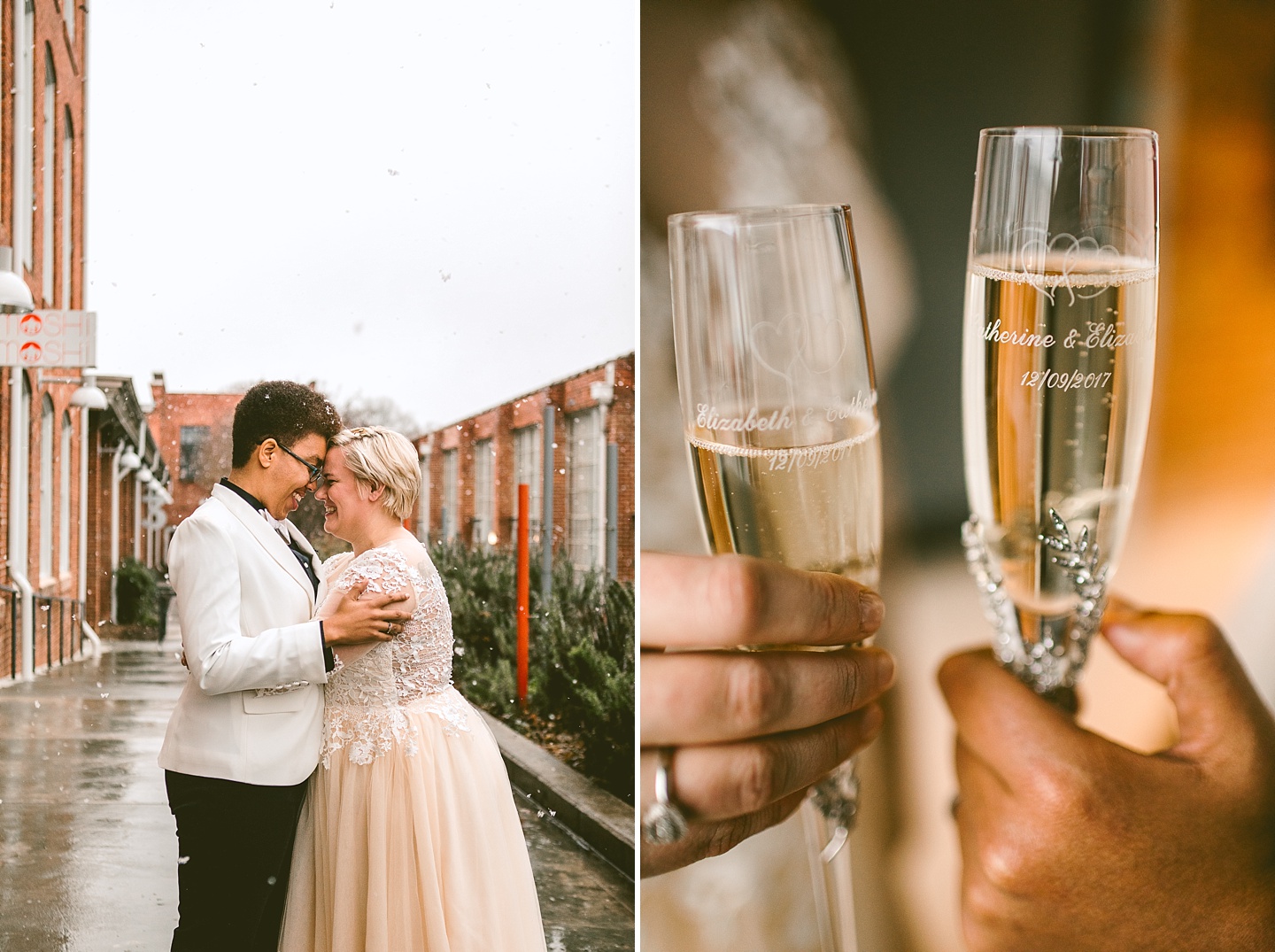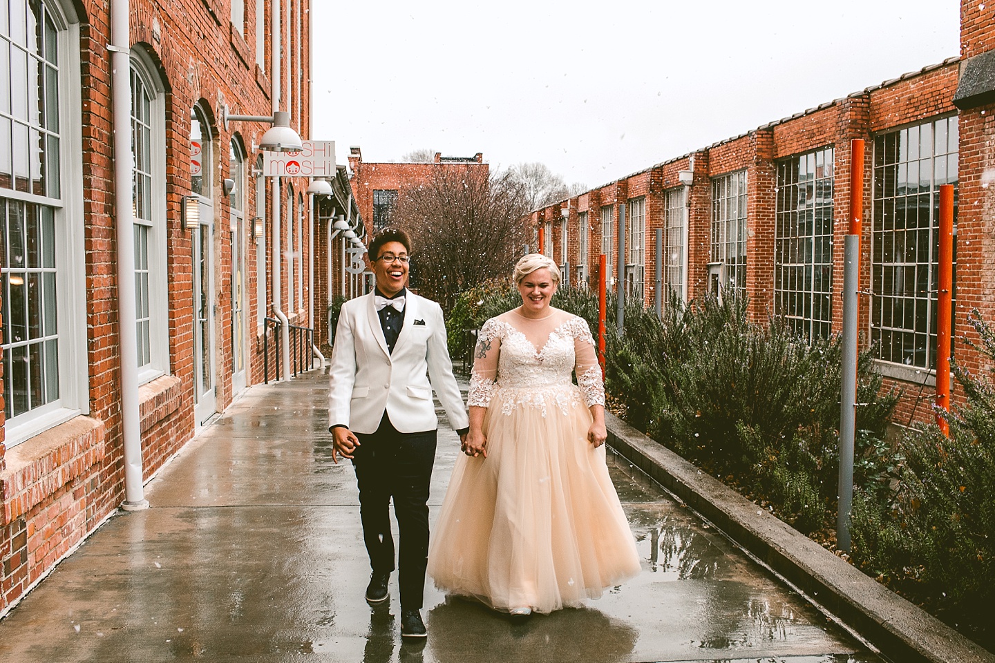 Winter weddings are always so lovely and this one was no exception. Elizabeth and Catherine, whom you may remember from their engagement session last spring, were married during a late morning ceremony at The Cotton Room in Durham in December. Their old rugby coach officiated, and they were surrounded by family, friends, and just a little bit of snow. :) It’s pretty rare to snow around here, and even more rare to snow during the day (for some reason our snow frequently comes in at night). Oftentimes the snow is actually ice. This snow consisted of large, puffy, beautiful flakes that added a bit of magic to the day, even though the snow didn’t stick. It nicely complemented the gorgeous winter decor of lit trees and candles and it all felt very warm and fuzzy.