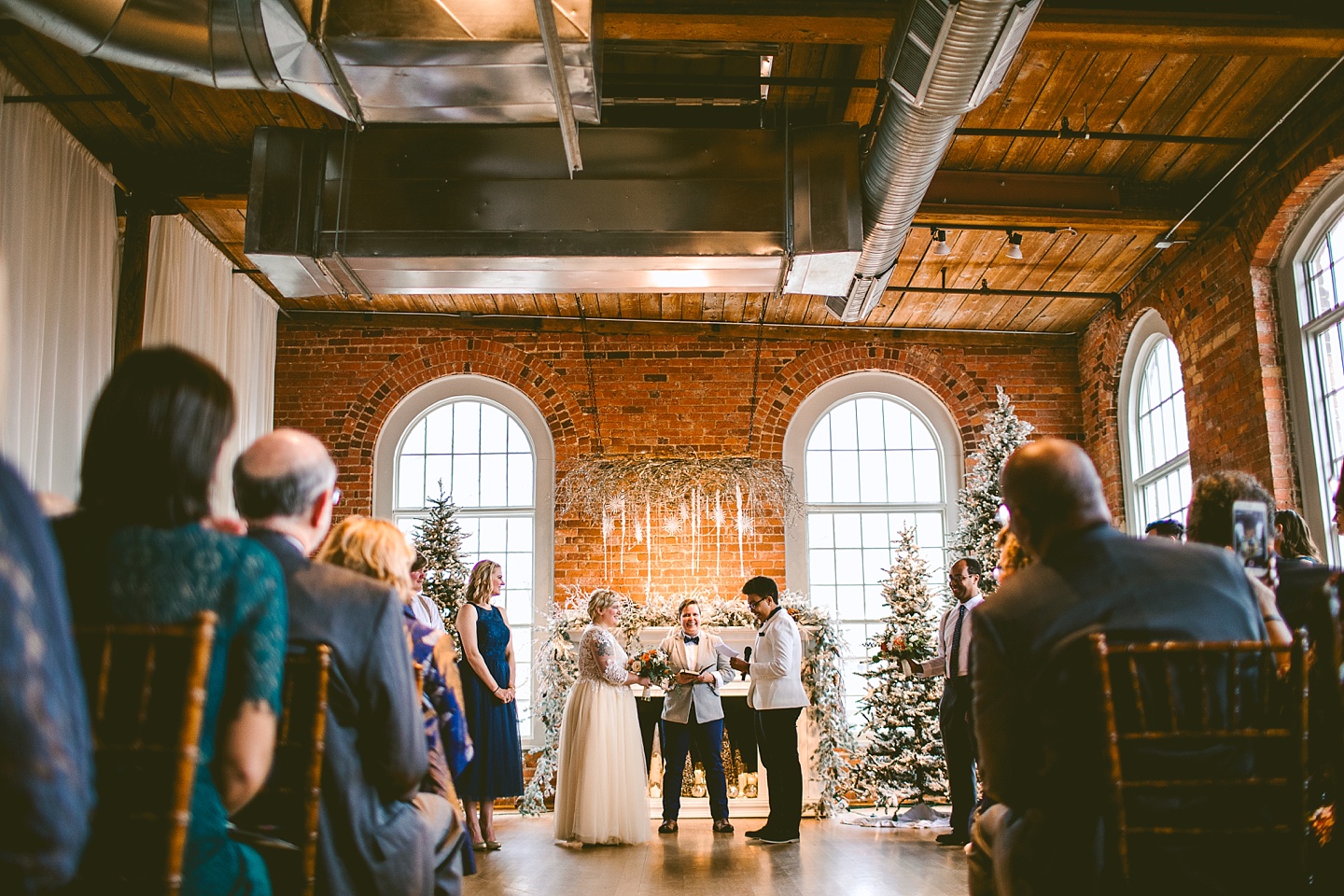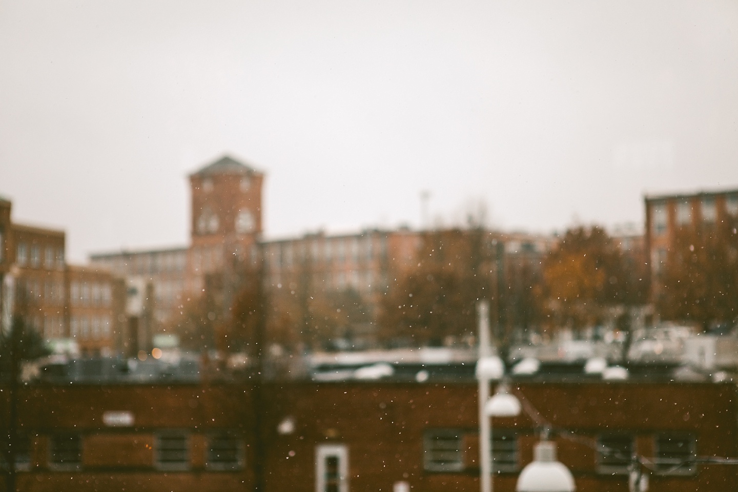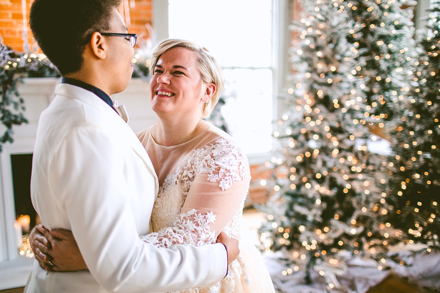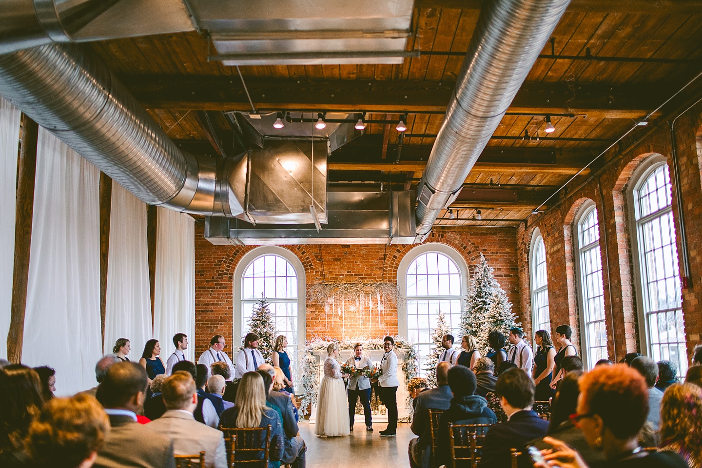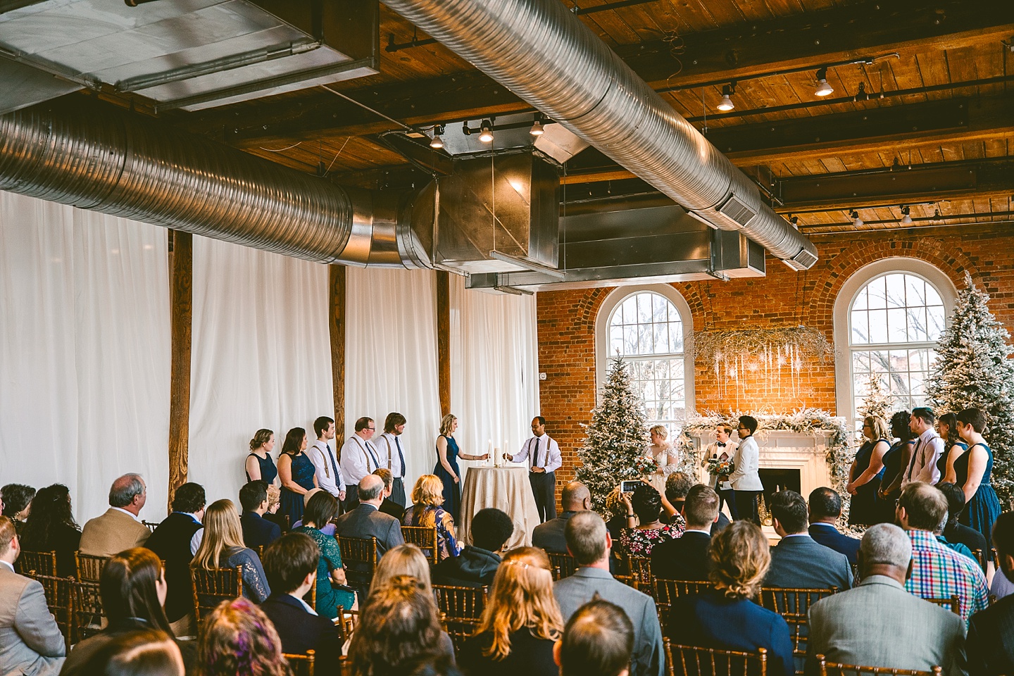 Winter weddings are always so lovely and this one was no exception. Elizabeth and Catherine, whom you may remember from their engagement session last spring, were married during a late morning ceremony at The Cotton Room in Durham in December. Their old rugby coach officiated, and they were surrounded by family, friends, and just a little bit of snow. :) It’s pretty rare to snow around here, and even more rare to snow during the day (for some reason our snow frequently comes in at night). Oftentimes the snow is actually ice. This snow consisted of large, puffy, beautiful flakes that added a bit of magic to the day, even though the snow didn’t stick. It nicely complemented the gorgeous winter decor of lit trees and candles and it all felt very warm and fuzzy.