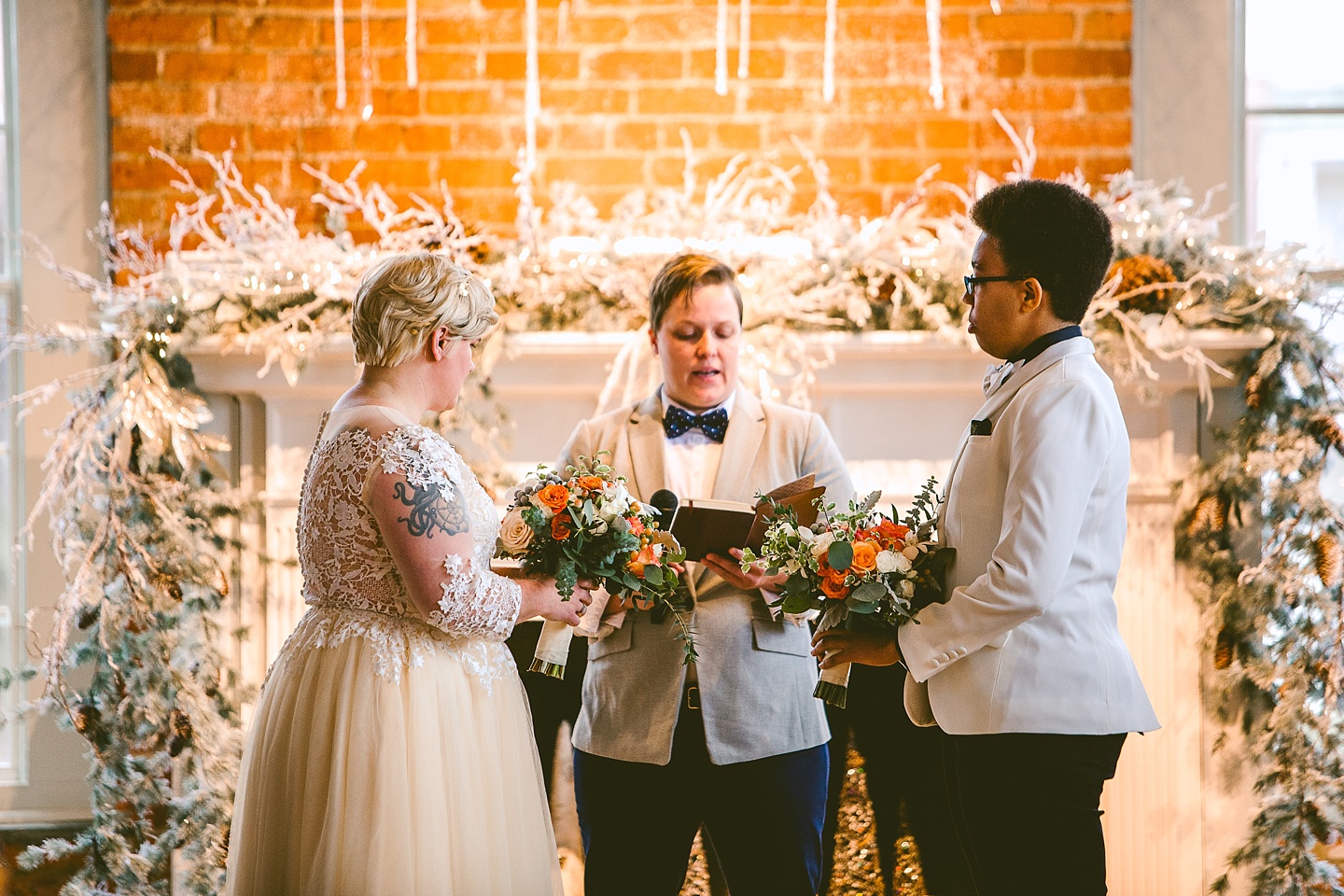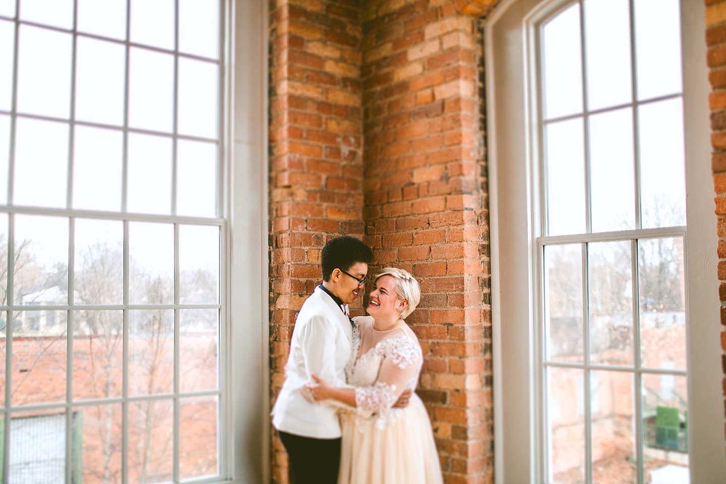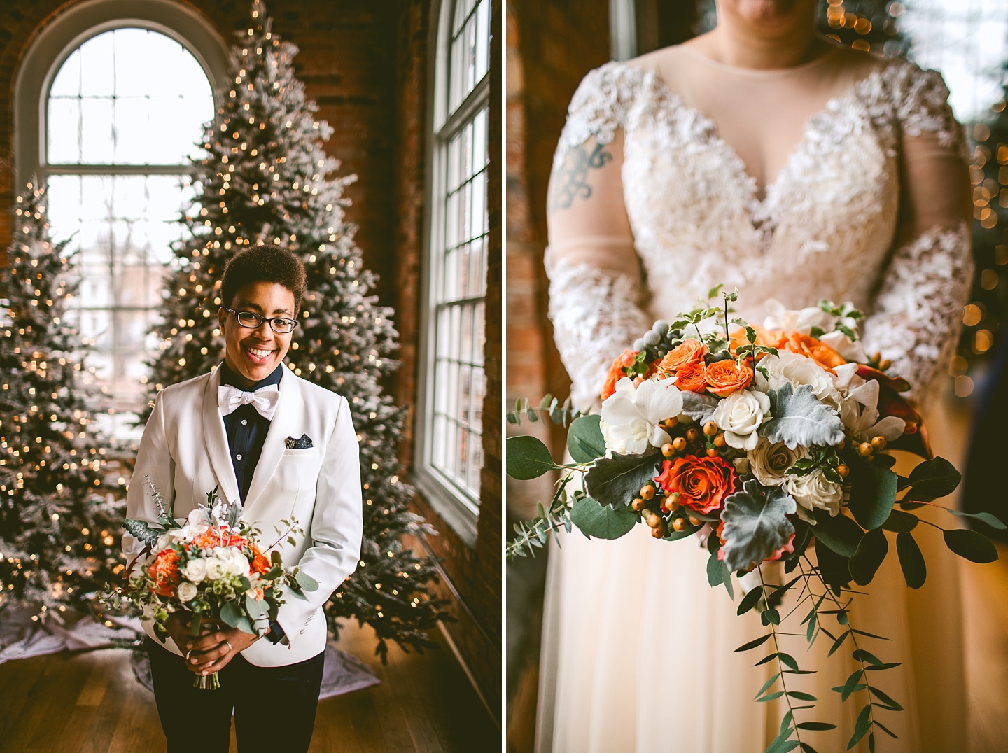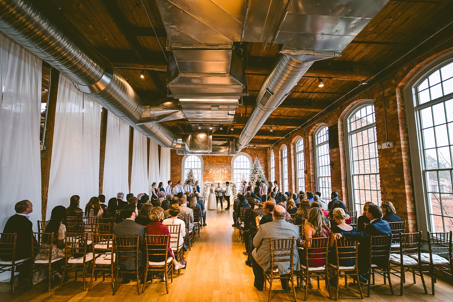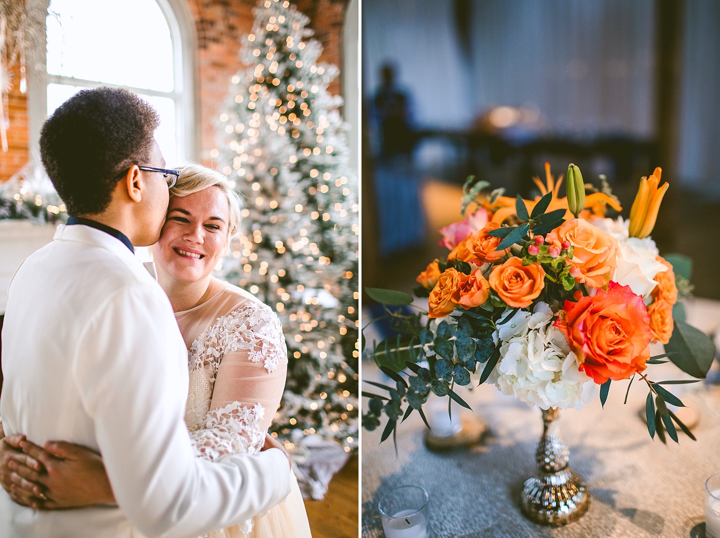 Winter weddings are always so lovely and this one was no exception. Elizabeth and Catherine, whom you may remember from their engagement session last spring, were married during a late morning ceremony at The Cotton Room in Durham in December. Their old rugby coach officiated, and they were surrounded by family, friends, and just a little bit of snow. :) It’s pretty rare to snow around here, and even more rare to snow during the day (for some reason our snow frequently comes in at night). Oftentimes the snow is actually ice. This snow consisted of large, puffy, beautiful flakes that added a bit of magic to the day, even though the snow didn’t stick. It nicely complemented the gorgeous winter decor of lit trees and candles and it all felt very warm and fuzzy.