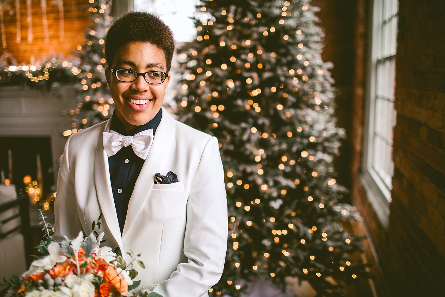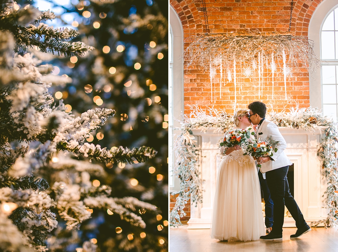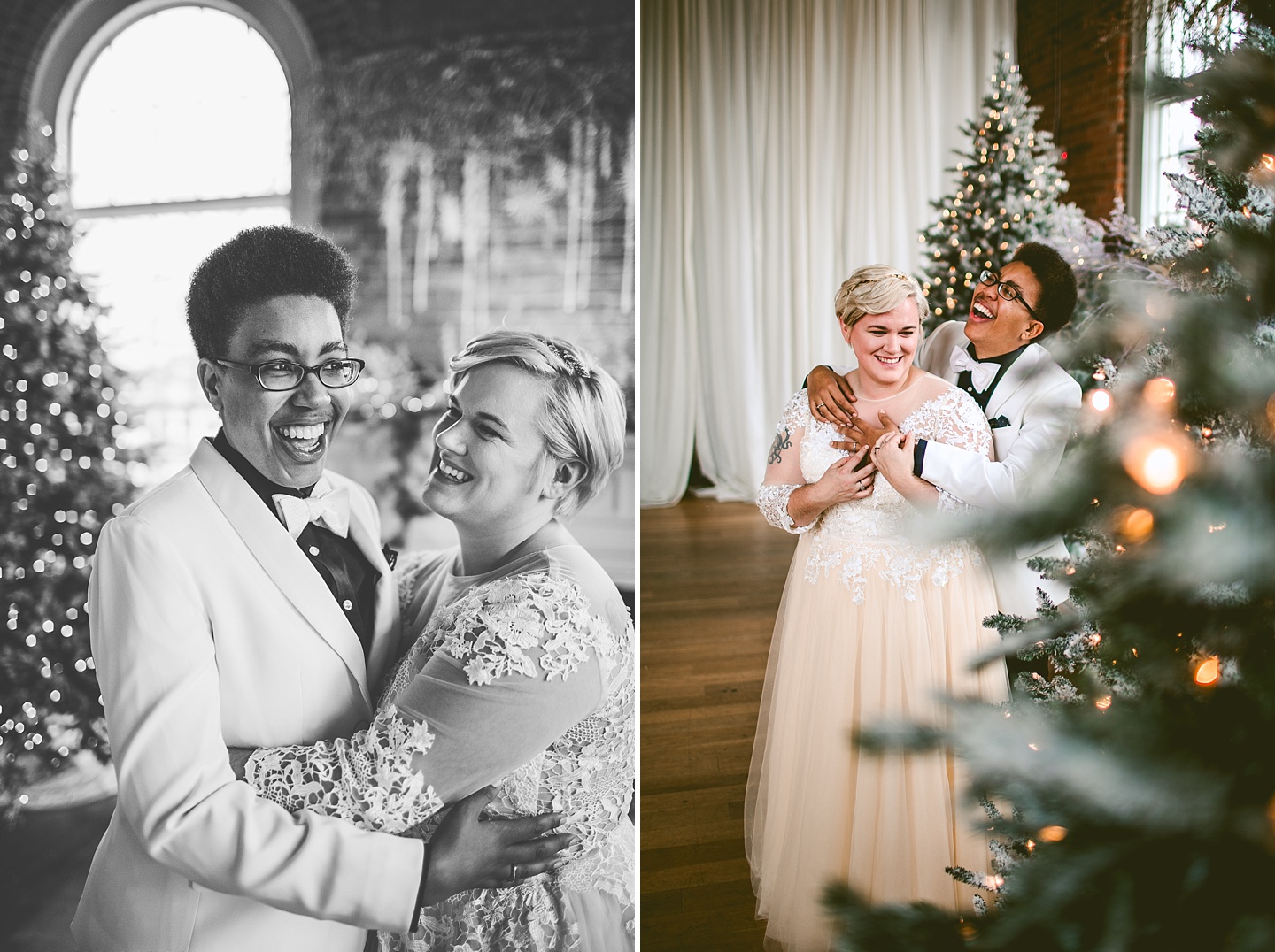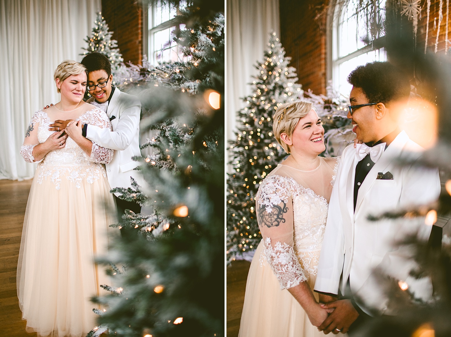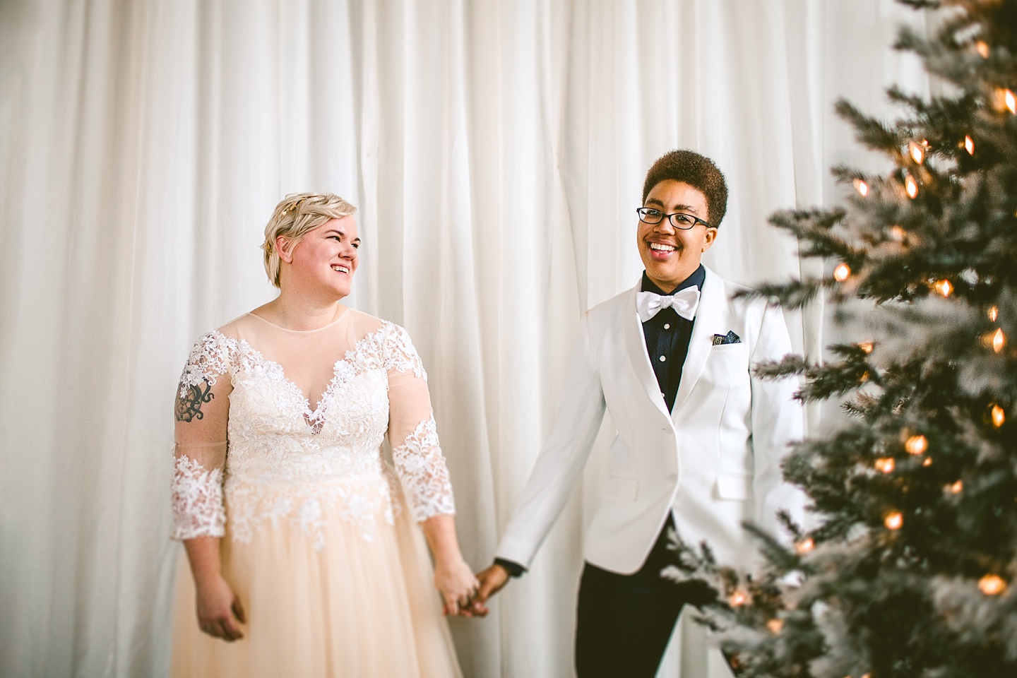 Winter weddings are always so lovely and this one was no exception. Elizabeth and Catherine, whom you may remember from their engagement session last spring, were married during a late morning ceremony at The Cotton Room in Durham in December. Their old rugby coach officiated, and they were surrounded by family, friends, and just a little bit of snow. :) It’s pretty rare to snow around here, and even more rare to snow during the day (for some reason our snow frequently comes in at night). Oftentimes the snow is actually ice. This snow consisted of large, puffy, beautiful flakes that added a bit of magic to the day, even though the snow didn’t stick. It nicely complemented the gorgeous winter decor of lit trees and candles and it all felt very warm and fuzzy.