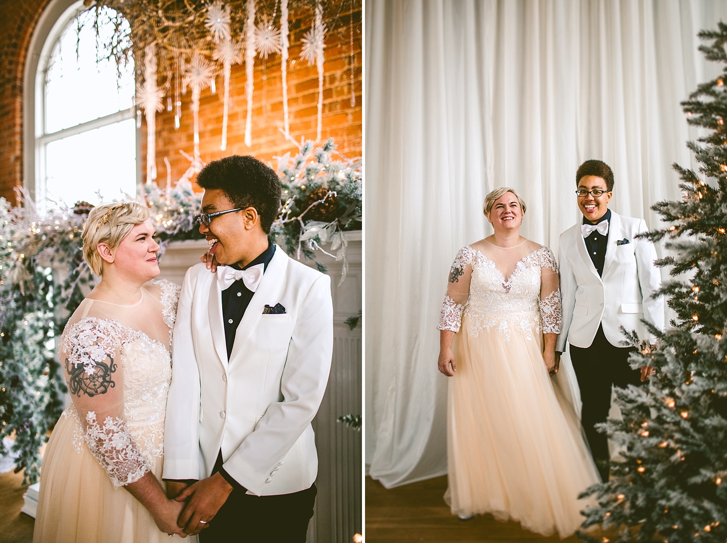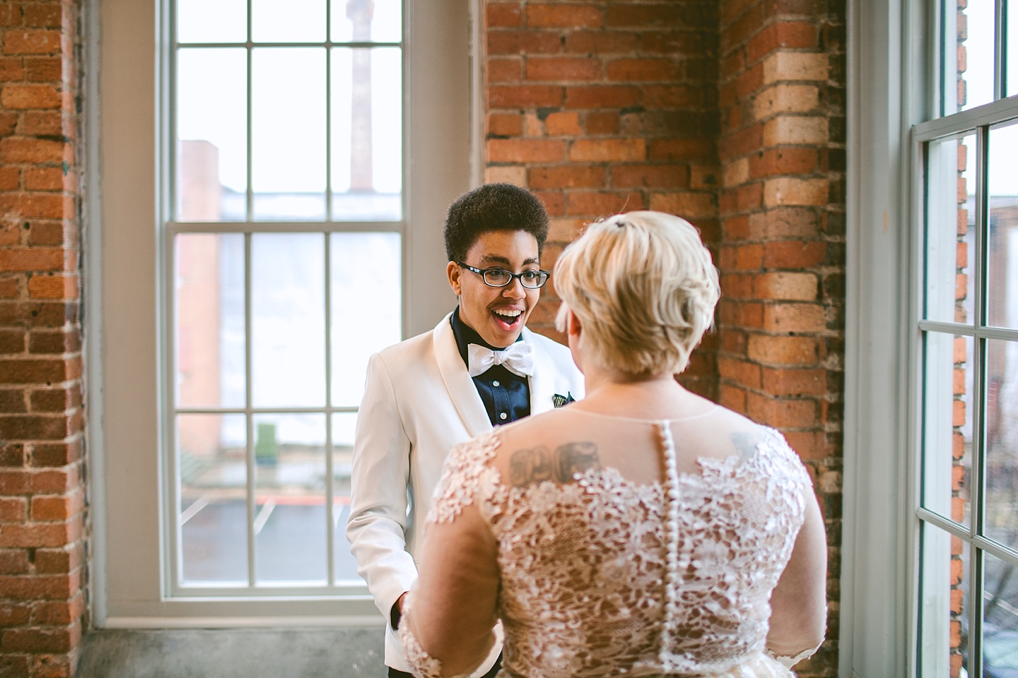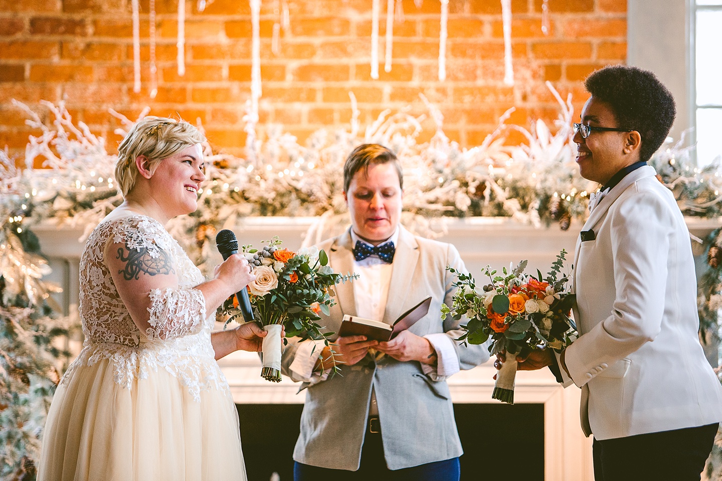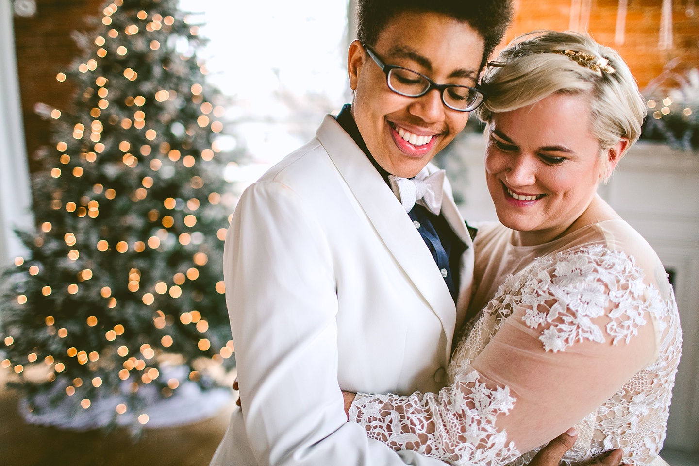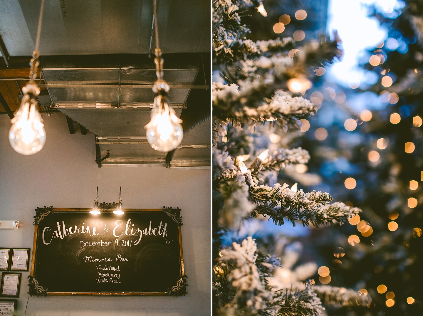 Winter weddings are always so lovely and this one was no exception. Elizabeth and Catherine, whom you may remember from their engagement session last spring, were married during a late morning ceremony at The Cotton Room in Durham in December. Their old rugby coach officiated, and they were surrounded by family, friends, and just a little bit of snow. :) It’s pretty rare to snow around here, and even more rare to snow during the day (for some reason our snow frequently comes in at night). Oftentimes the snow is actually ice. This snow consisted of large, puffy, beautiful flakes that added a bit of magic to the day, even though the snow didn’t stick. It nicely complemented the gorgeous winter decor of lit trees and candles and it all felt very warm and fuzzy.