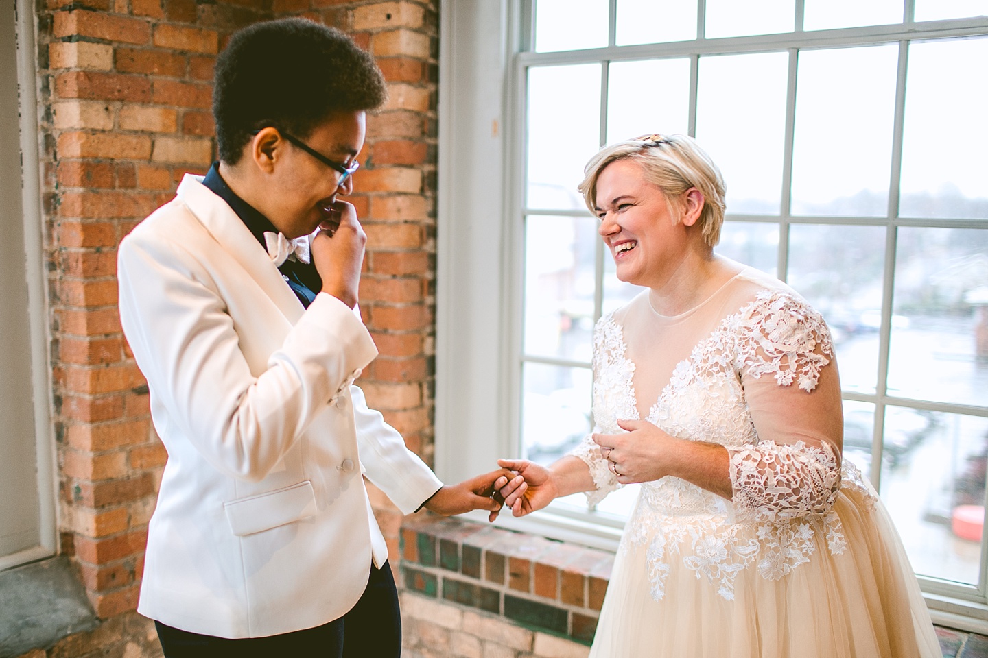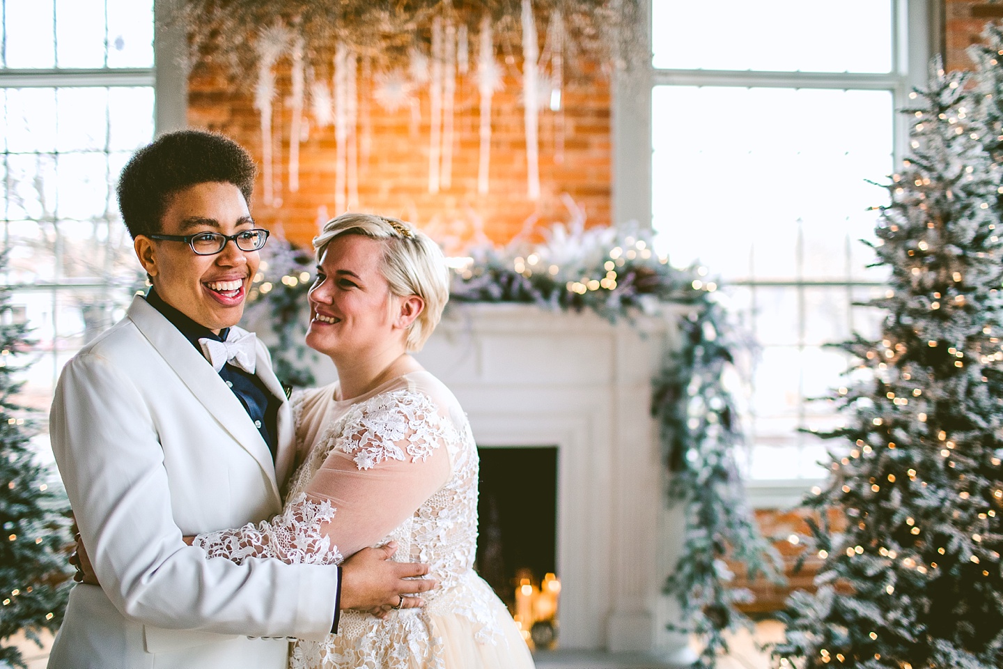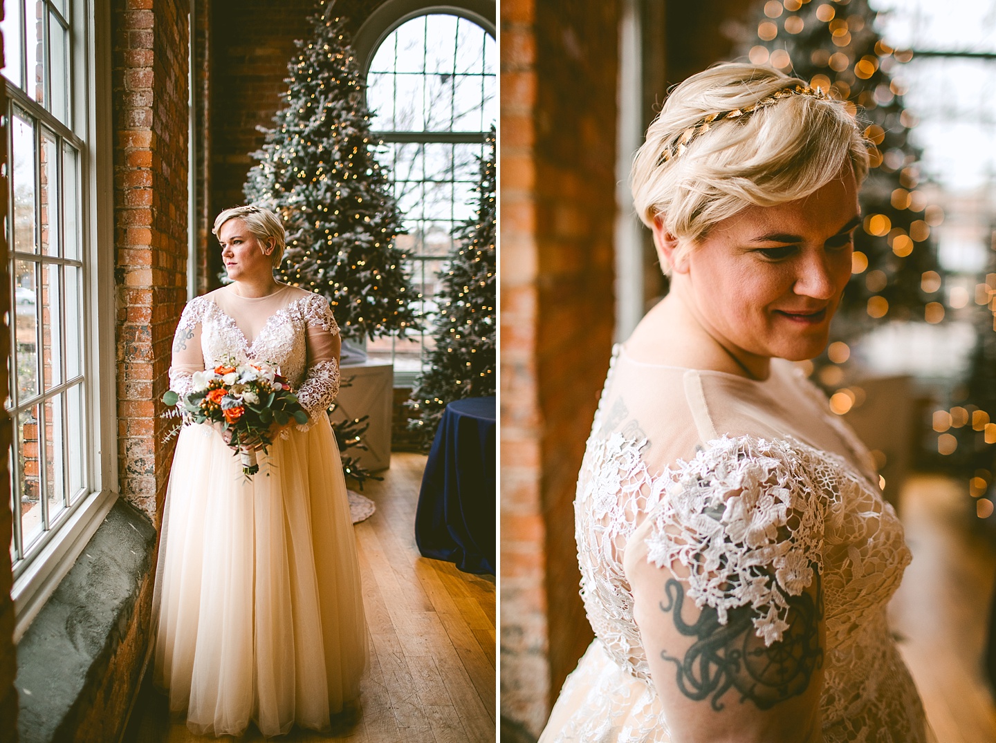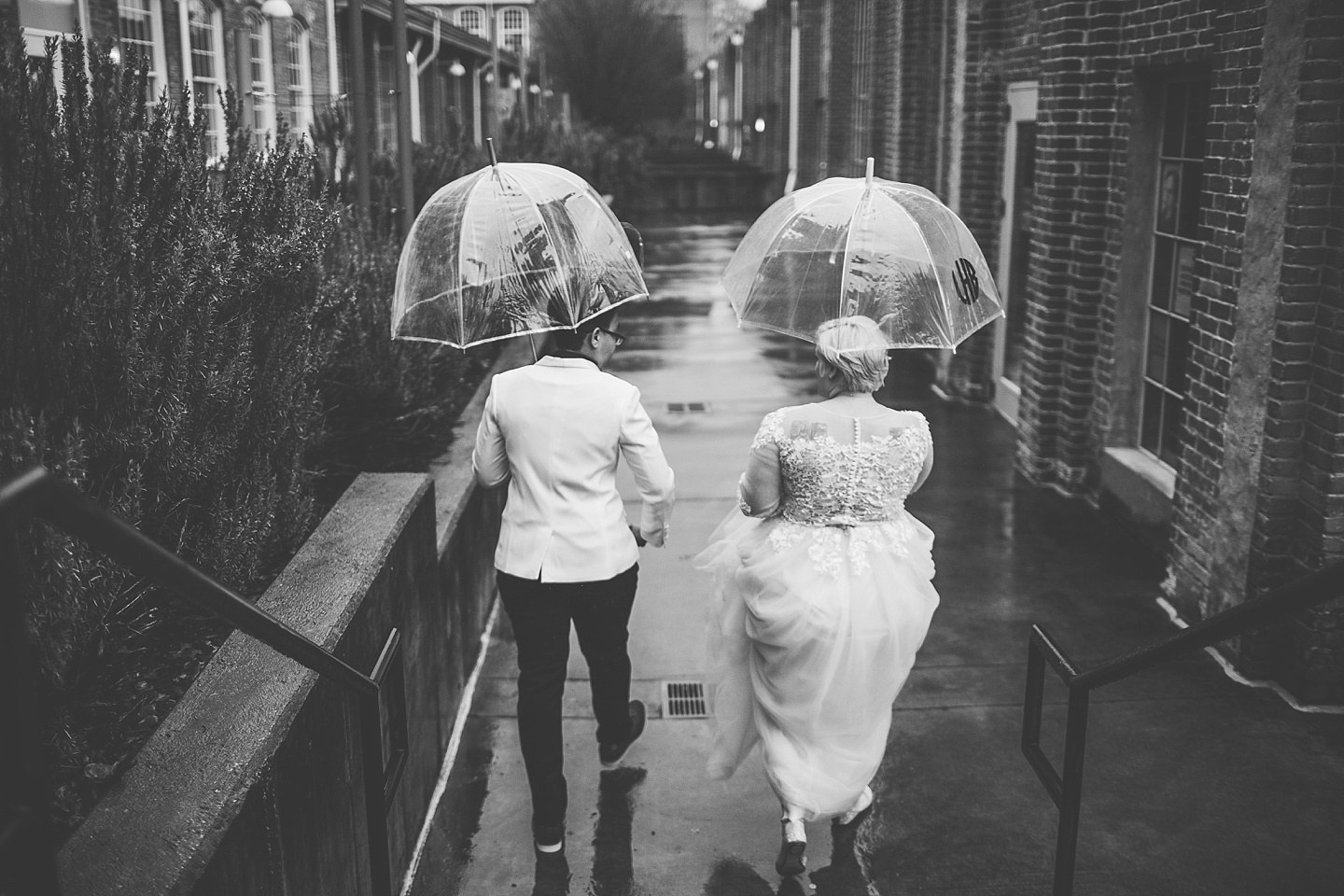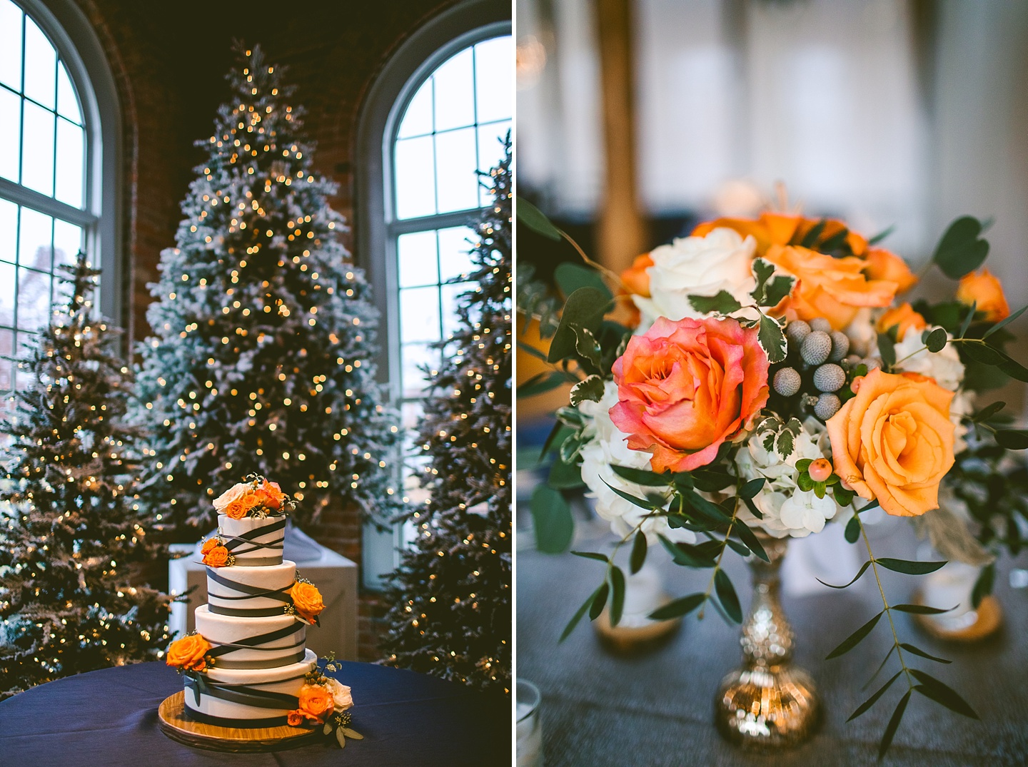 Winter weddings are always so lovely and this one was no exception. Elizabeth and Catherine, whom you may remember from their engagement session last spring, were married during a late morning ceremony at The Cotton Room in Durham in December. Their old rugby coach officiated, and they were surrounded by family, friends, and just a little bit of snow. :) It’s pretty rare to snow around here, and even more rare to snow during the day (for some reason our snow frequently comes in at night). Oftentimes the snow is actually ice. This snow consisted of large, puffy, beautiful flakes that added a bit of magic to the day, even though the snow didn’t stick. It nicely complemented the gorgeous winter decor of lit trees and candles and it all felt very warm and fuzzy.