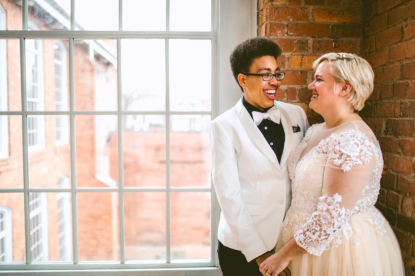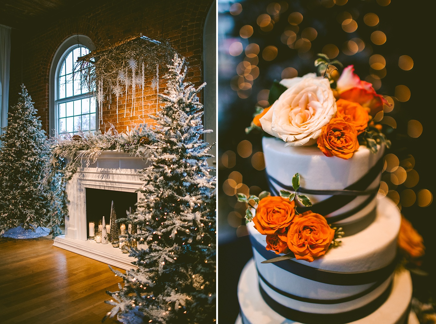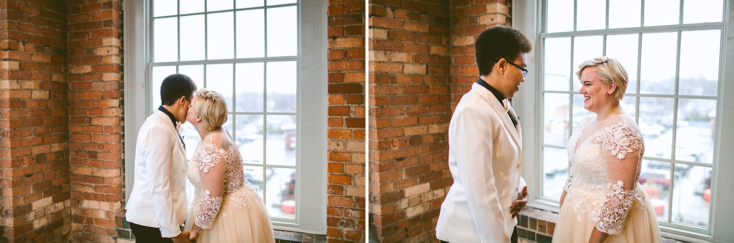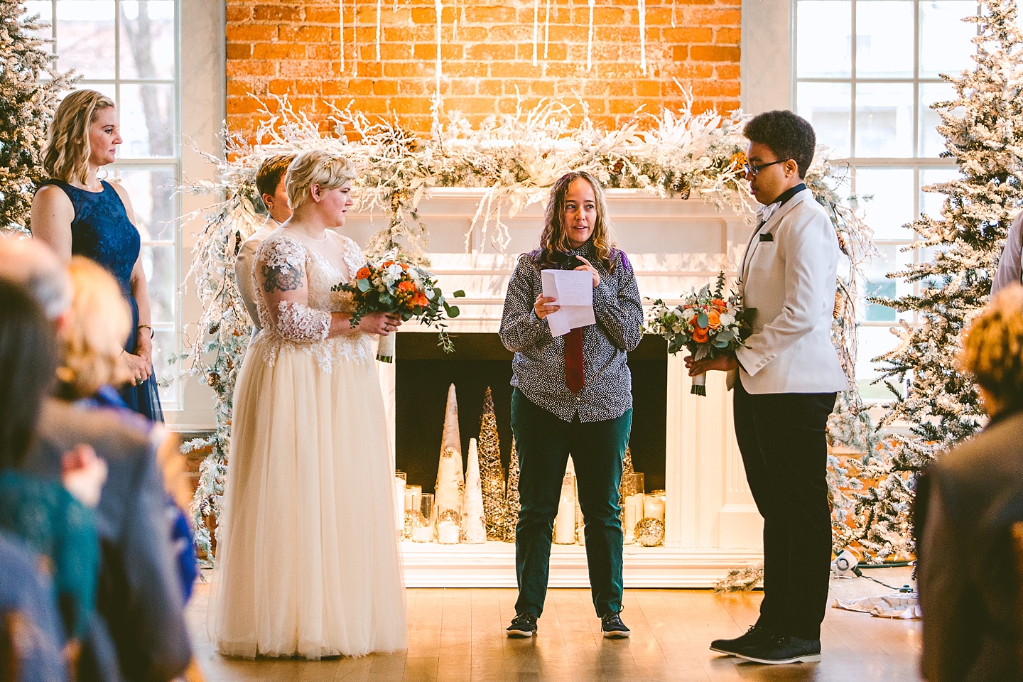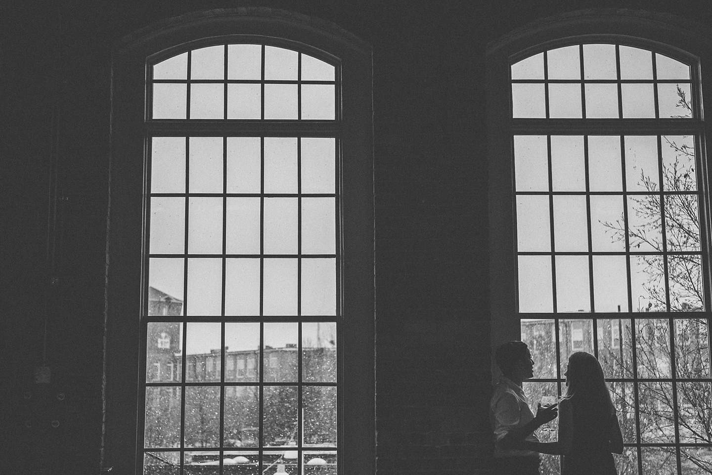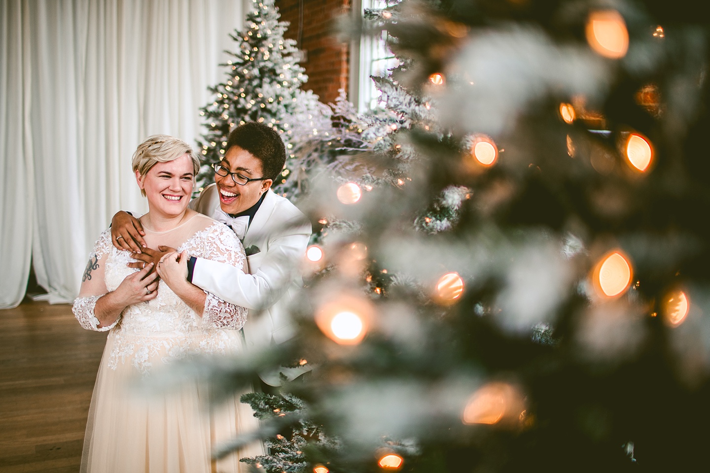 Winter weddings are always so lovely and this one was no exception. Elizabeth and Catherine, whom you may remember from their engagement session last spring, were married during a late morning ceremony at The Cotton Room in Durham in December. Their old rugby coach officiated, and they were surrounded by family, friends, and just a little bit of snow. :) It’s pretty rare to snow around here, and even more rare to snow during the day (for some reason our snow frequently comes in at night). Oftentimes the snow is actually ice. This snow consisted of large, puffy, beautiful flakes that added a bit of magic to the day, even though the snow didn’t stick. It nicely complemented the gorgeous winter decor of lit trees and candles and it all felt very warm and fuzzy.