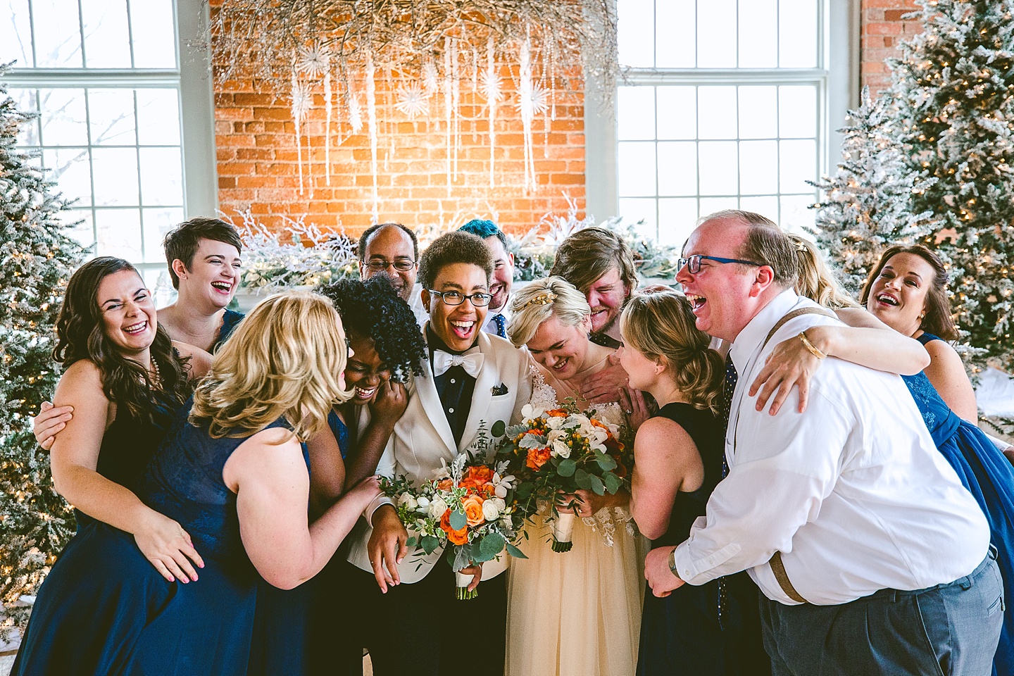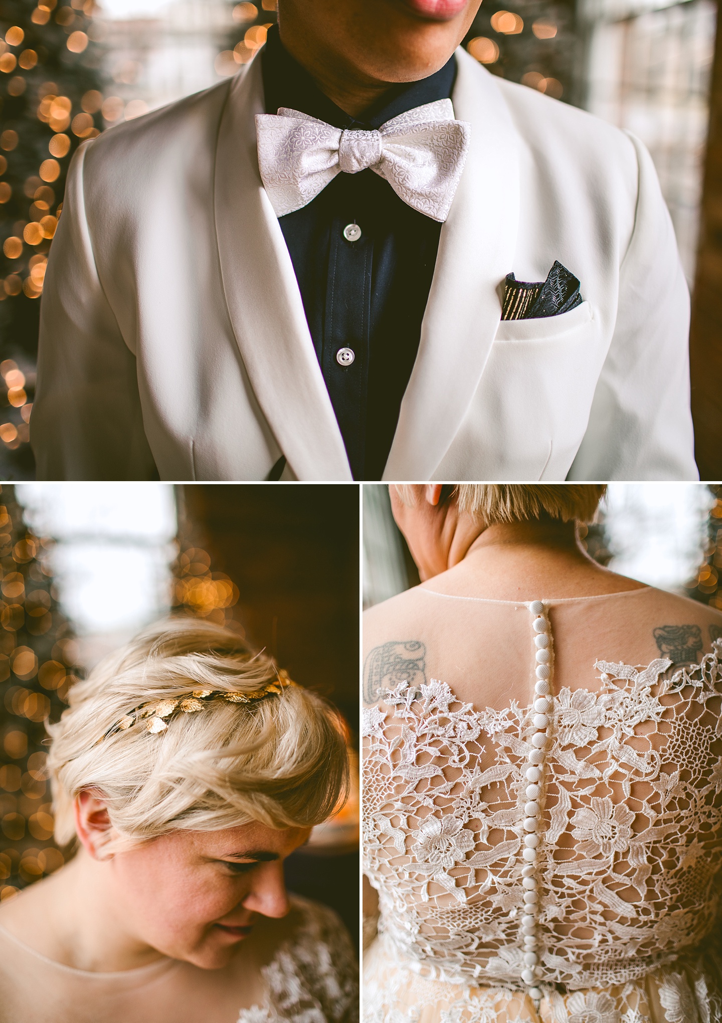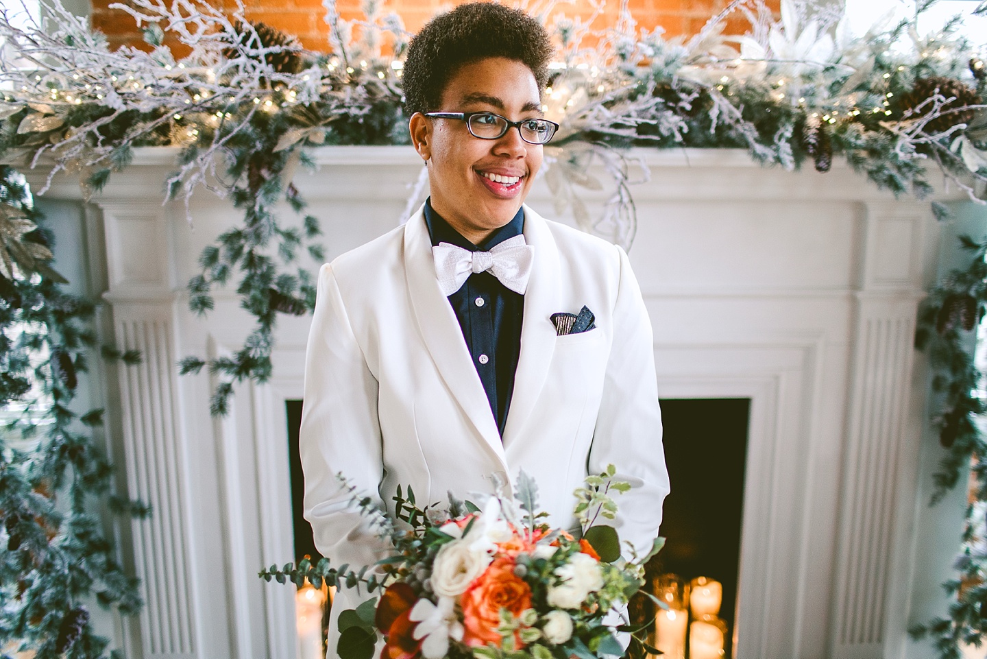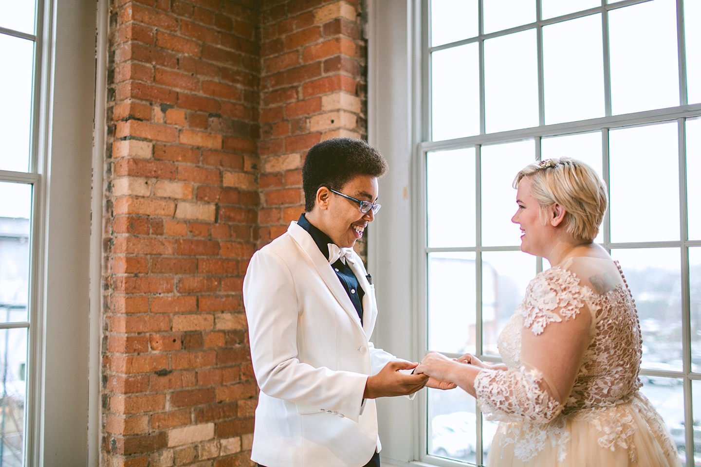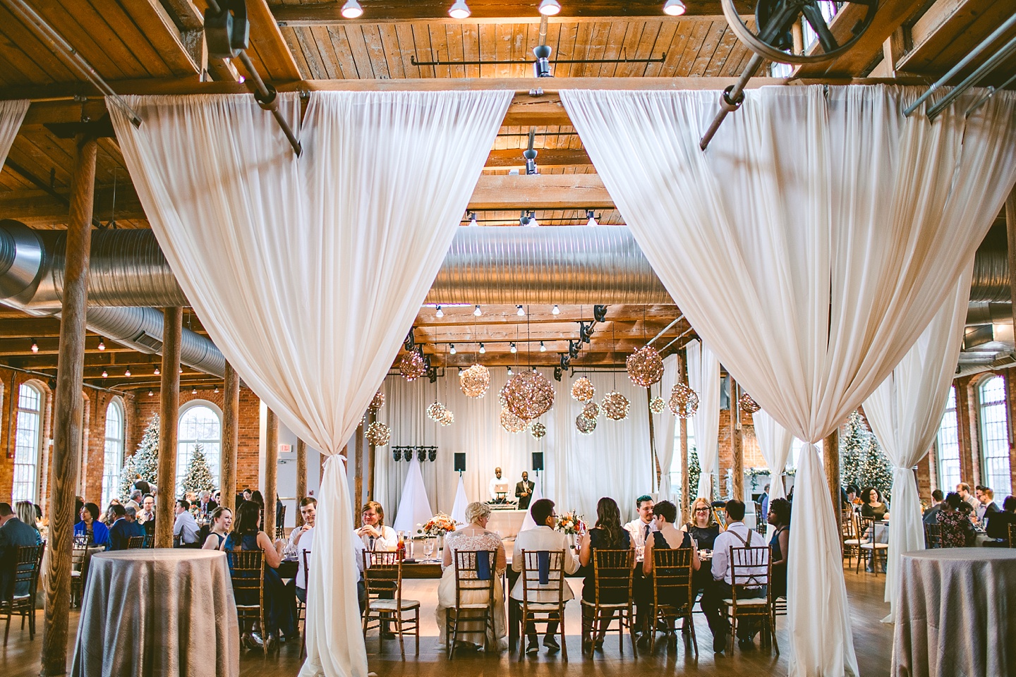Winter weddings are always so lovely and this one was no exception. Elizabeth and Catherine, whom you may remember from their engagement session last spring, were married during a late morning ceremony at The Cotton Room in Durham in December. Their old rugby coach officiated, and they were surrounded by family, friends, and just a little bit of snow. :) It’s pretty rare to snow around here, and even more rare to snow during the day (for some reason our snow frequently comes in at night). Oftentimes the snow is actually ice. This snow consisted of large, puffy, beautiful flakes that added a bit of magic to the day, even though the snow didn’t stick. It nicely complemented the gorgeous winter decor of lit trees and candles and it all felt very warm and fuzzy.