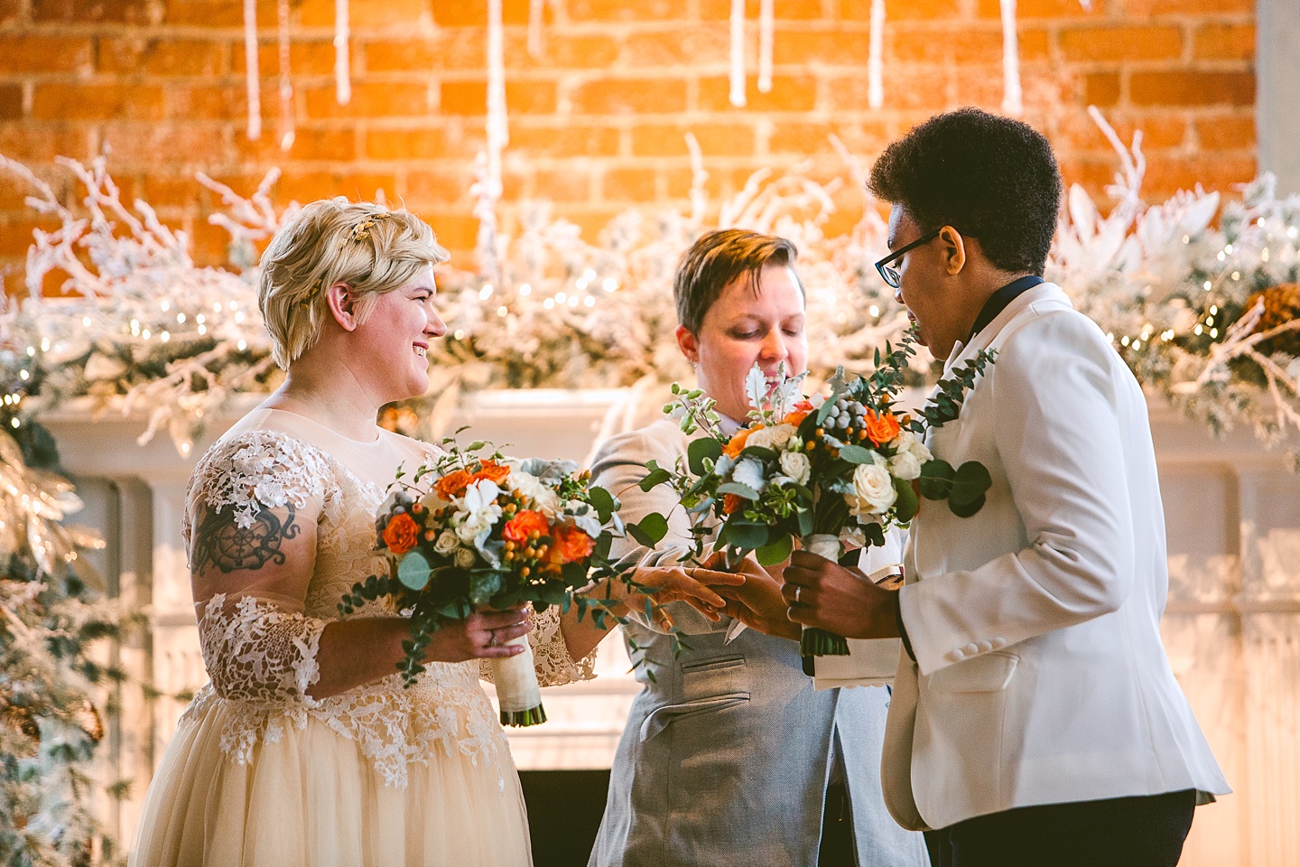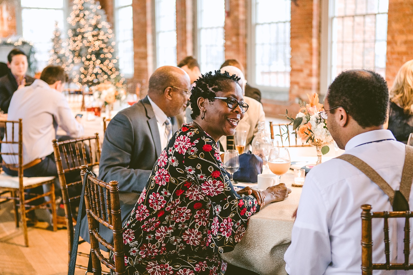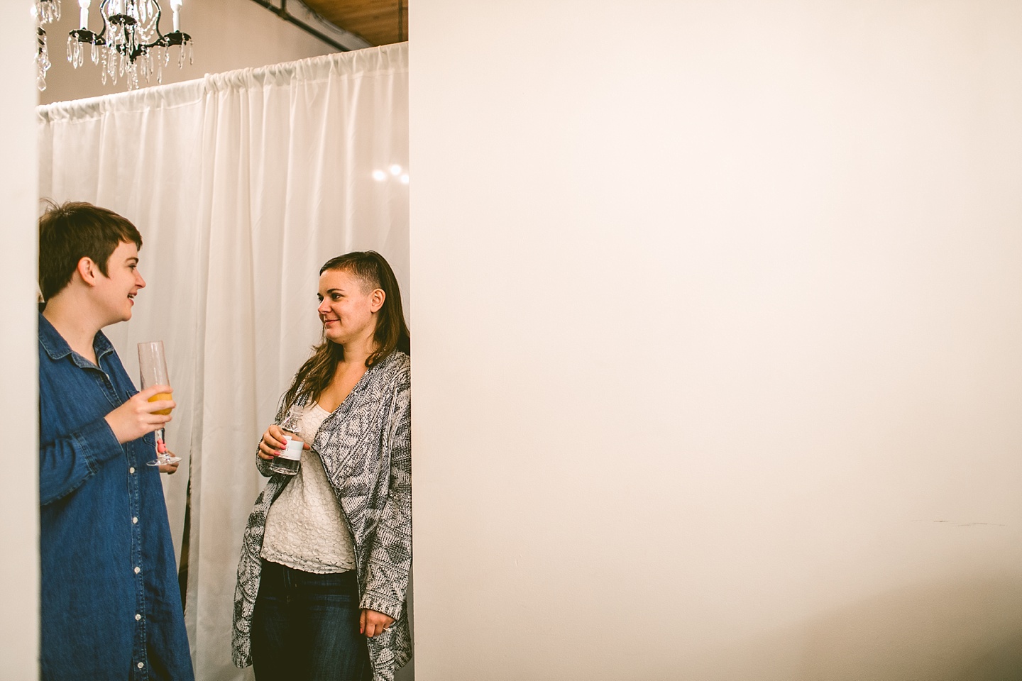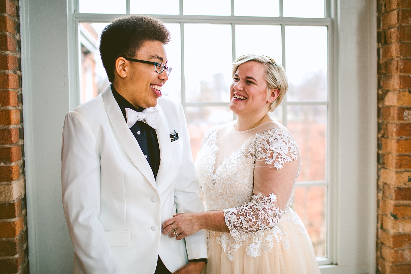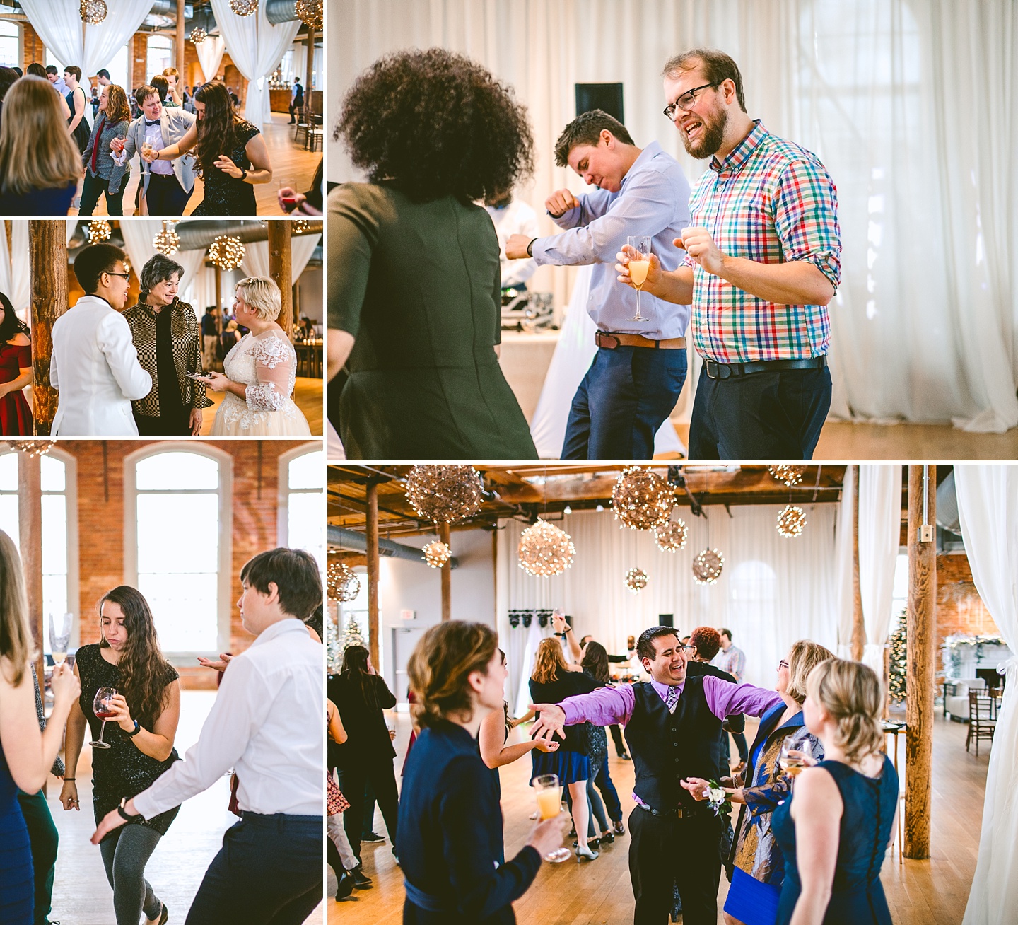 Winter weddings are always so lovely and this one was no exception. Elizabeth and Catherine, whom you may remember from their engagement session last spring, were married during a late morning ceremony at The Cotton Room in Durham in December. Their old rugby coach officiated, and they were surrounded by family, friends, and just a little bit of snow. :) It’s pretty rare to snow around here, and even more rare to snow during the day (for some reason our snow frequently comes in at night). Oftentimes the snow is actually ice. This snow consisted of large, puffy, beautiful flakes that added a bit of magic to the day, even though the snow didn’t stick. It nicely complemented the gorgeous winter decor of lit trees and candles and it all felt very warm and fuzzy.