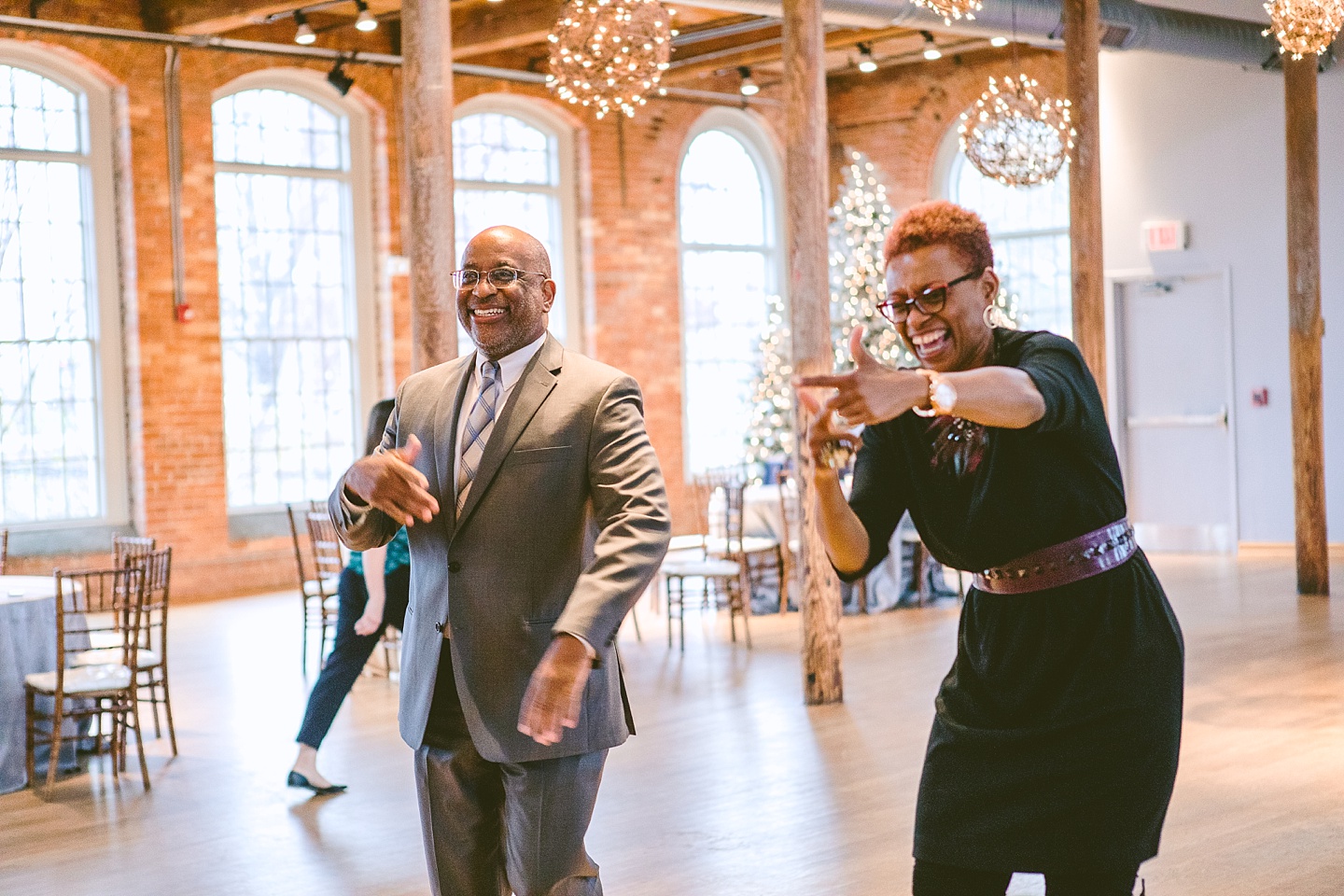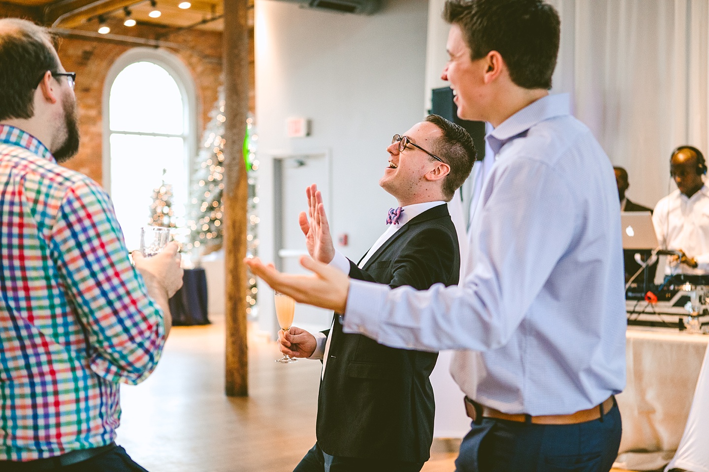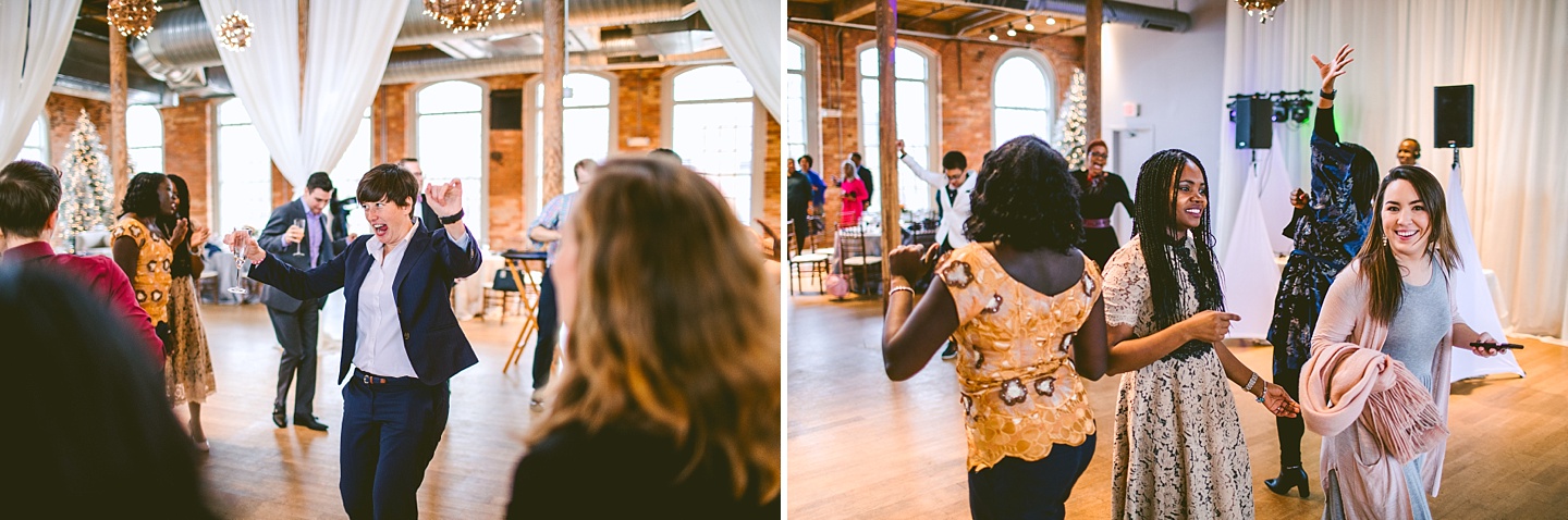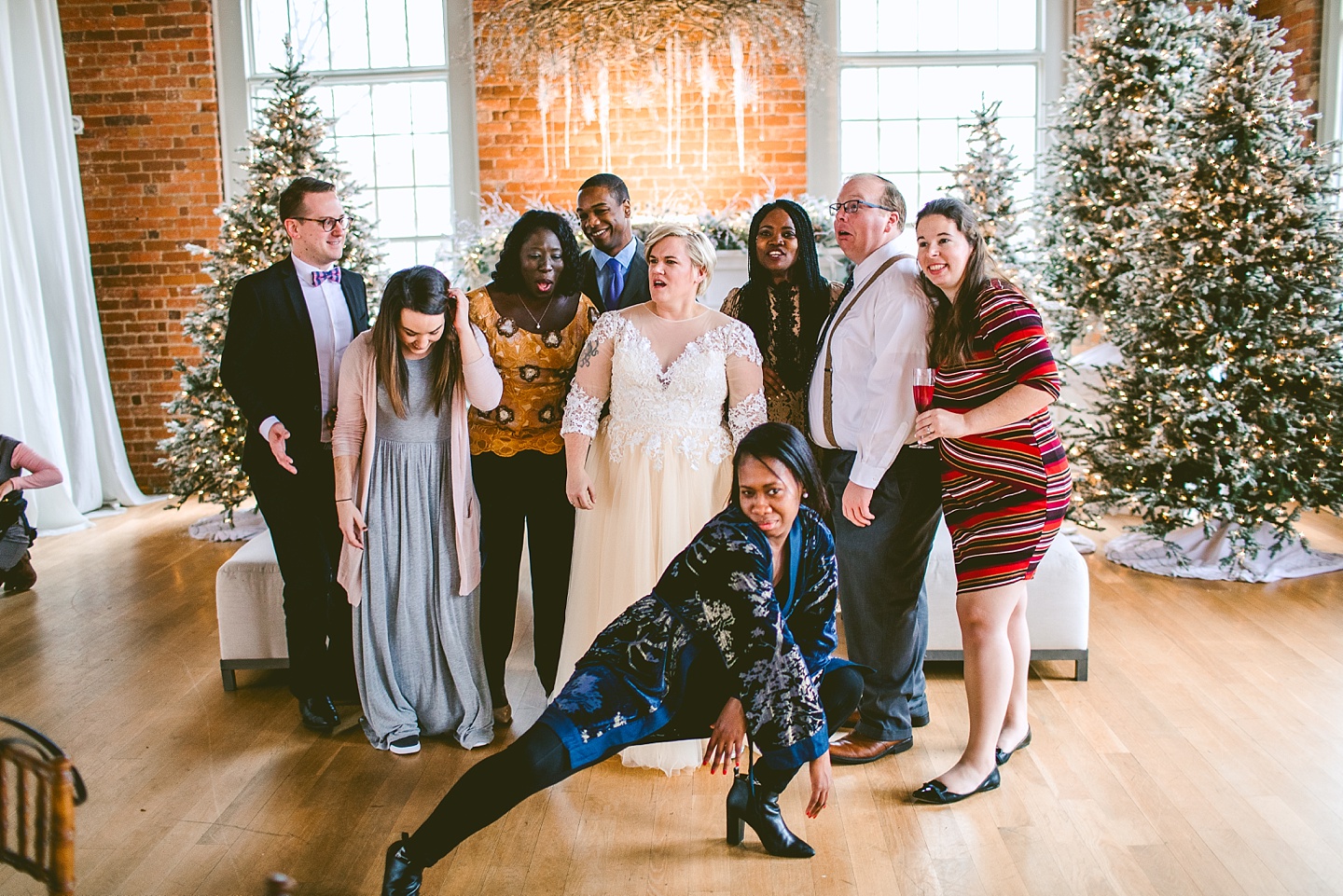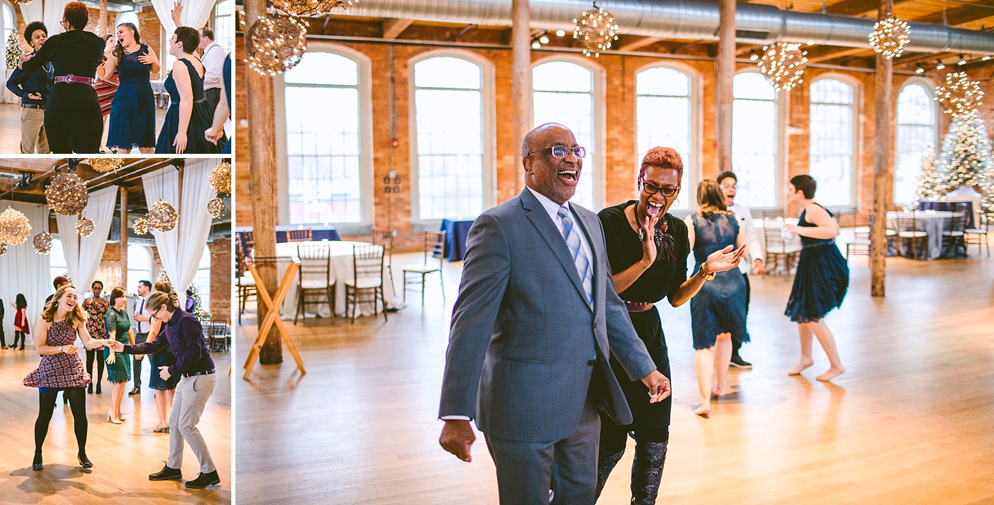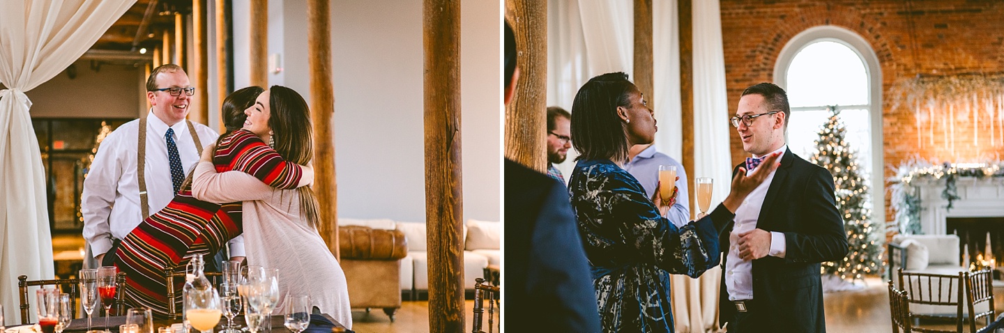 Winter weddings are always so lovely and this one was no exception. Elizabeth and Catherine, whom you may remember from their engagement session last spring, were married during a late morning ceremony at The Cotton Room in Durham in December. Their old rugby coach officiated, and they were surrounded by family, friends, and just a little bit of snow. :) It’s pretty rare to snow around here, and even more rare to snow during the day (for some reason our snow frequently comes in at night). Oftentimes the snow is actually ice. This snow consisted of large, puffy, beautiful flakes that added a bit of magic to the day, even though the snow didn’t stick. It nicely complemented the gorgeous winter decor of lit trees and candles and it all felt very warm and fuzzy.