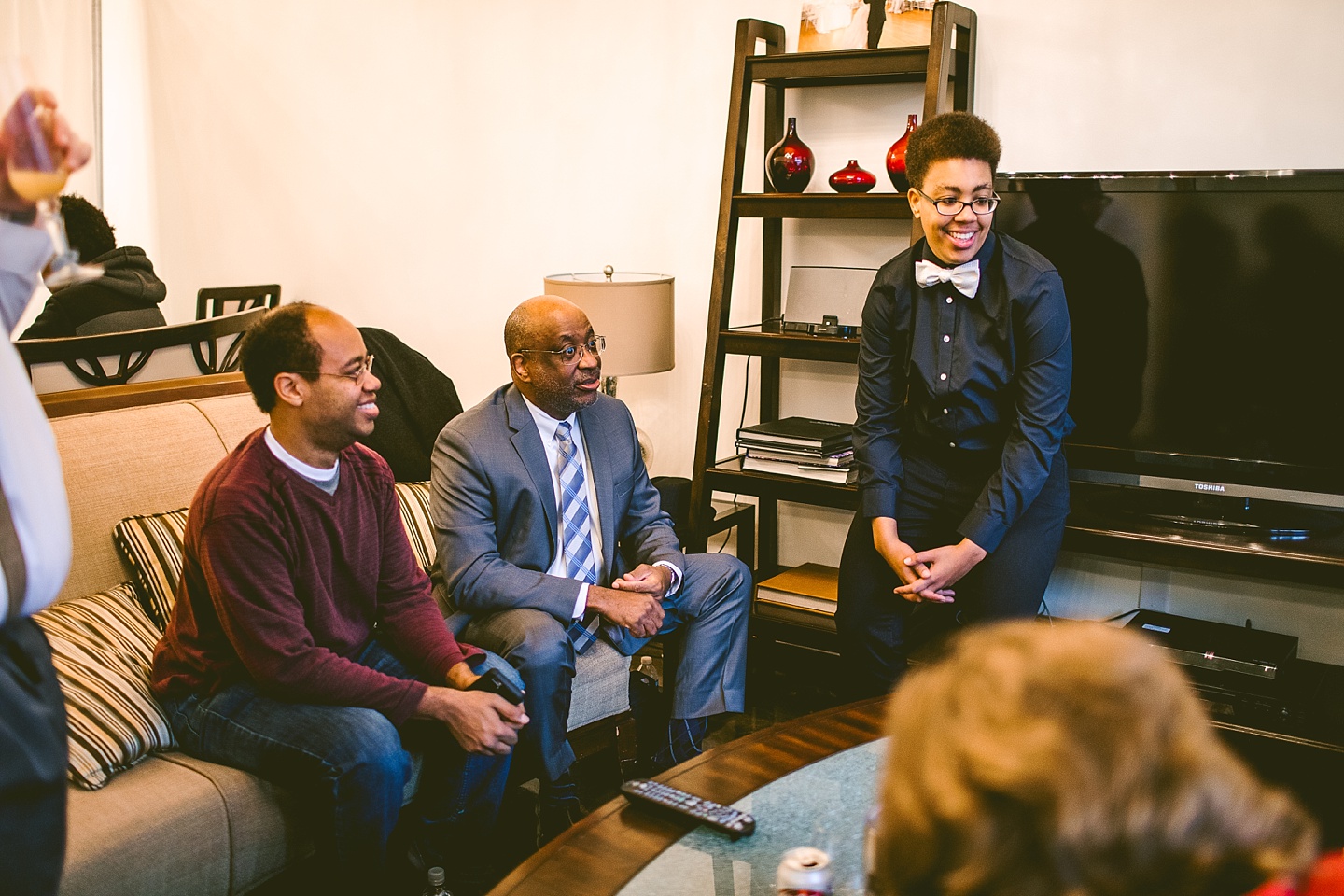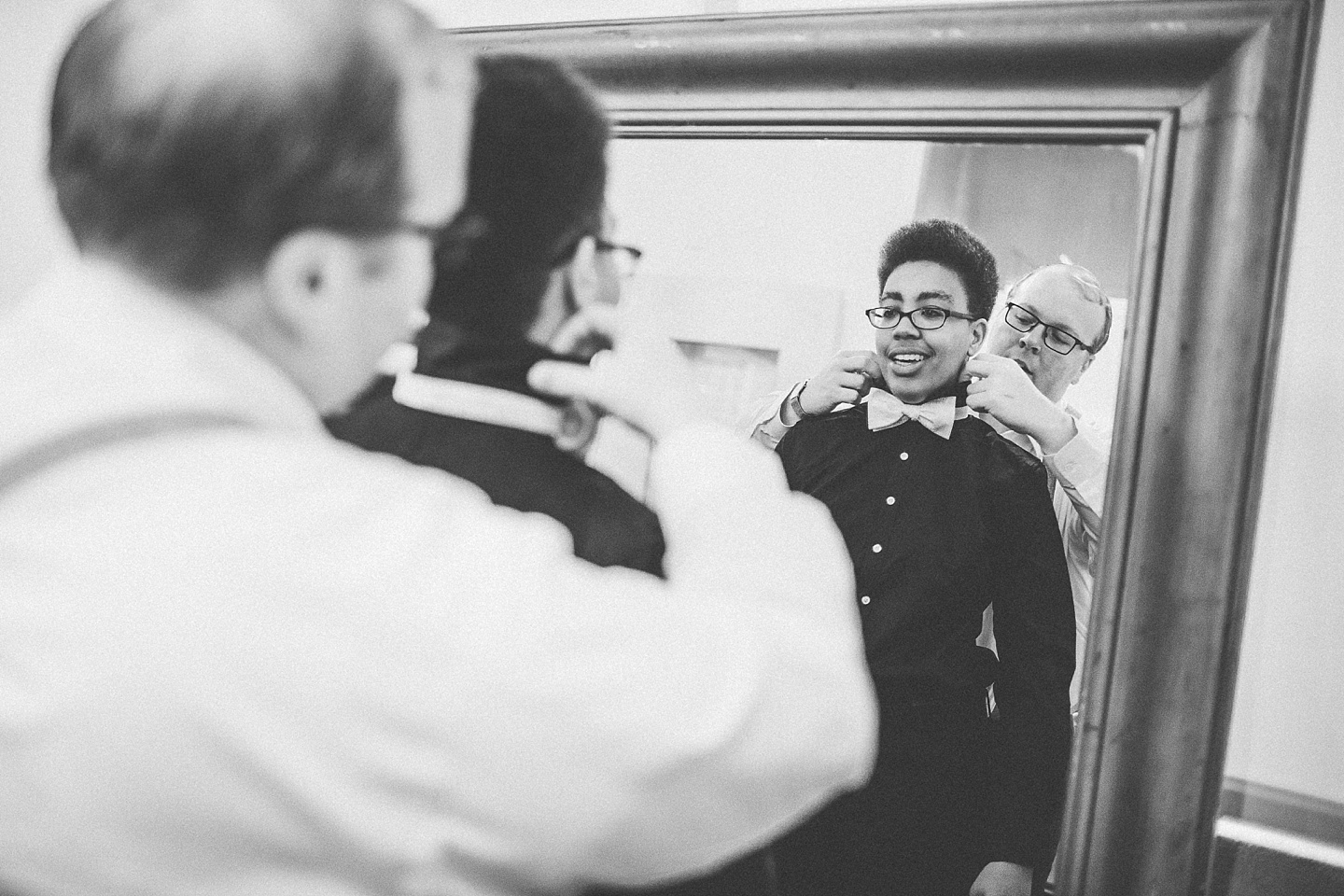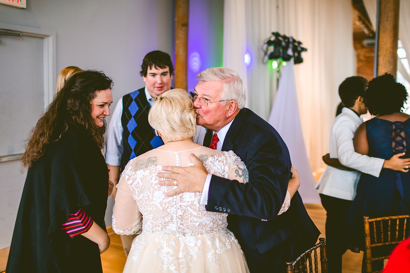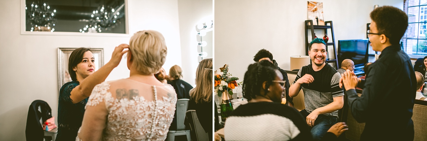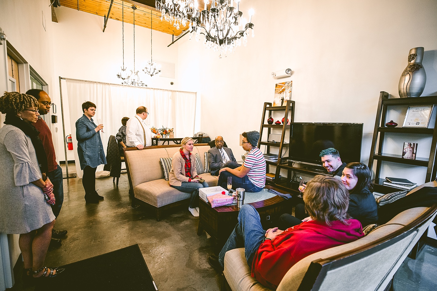Winter weddings are always so lovely and this one was no exception. Elizabeth and Catherine, whom you may remember from their engagement session last spring, were married during a late morning ceremony at The Cotton Room in Durham in December. Their old rugby coach officiated, and they were surrounded by family, friends, and just a little bit of snow. :) It’s pretty rare to snow around here, and even more rare to snow during the day (for some reason our snow frequently comes in at night). Oftentimes the snow is actually ice. This snow consisted of large, puffy, beautiful flakes that added a bit of magic to the day, even though the snow didn’t stick. It nicely complemented the gorgeous winter decor of lit trees and candles and it all felt very warm and fuzzy.